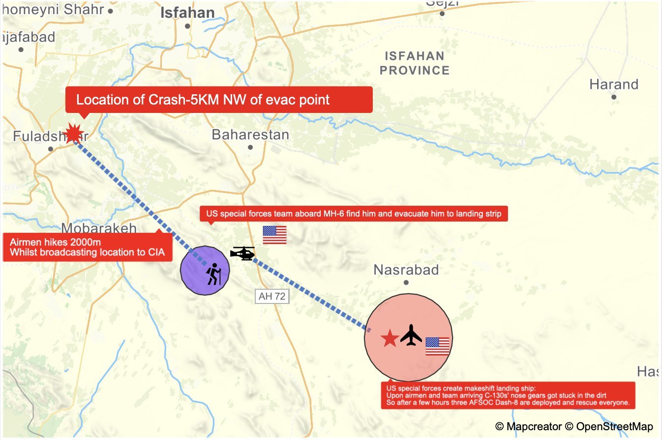 ² 然后他跟美军联系上,并进行通话。美军在图1右下角10公里远处临时降落、集结,派直升机接到美国飞行员。与此同时,美军在空中对四面八方赶过来的伊朗人扫射。大量美军在这里滞留3小时,直到新的飞机支援,把所有人接走。临走炸毁运输机、直升机。伊朗人捡到了照烧牛肉条、防晒霜、牙膏。