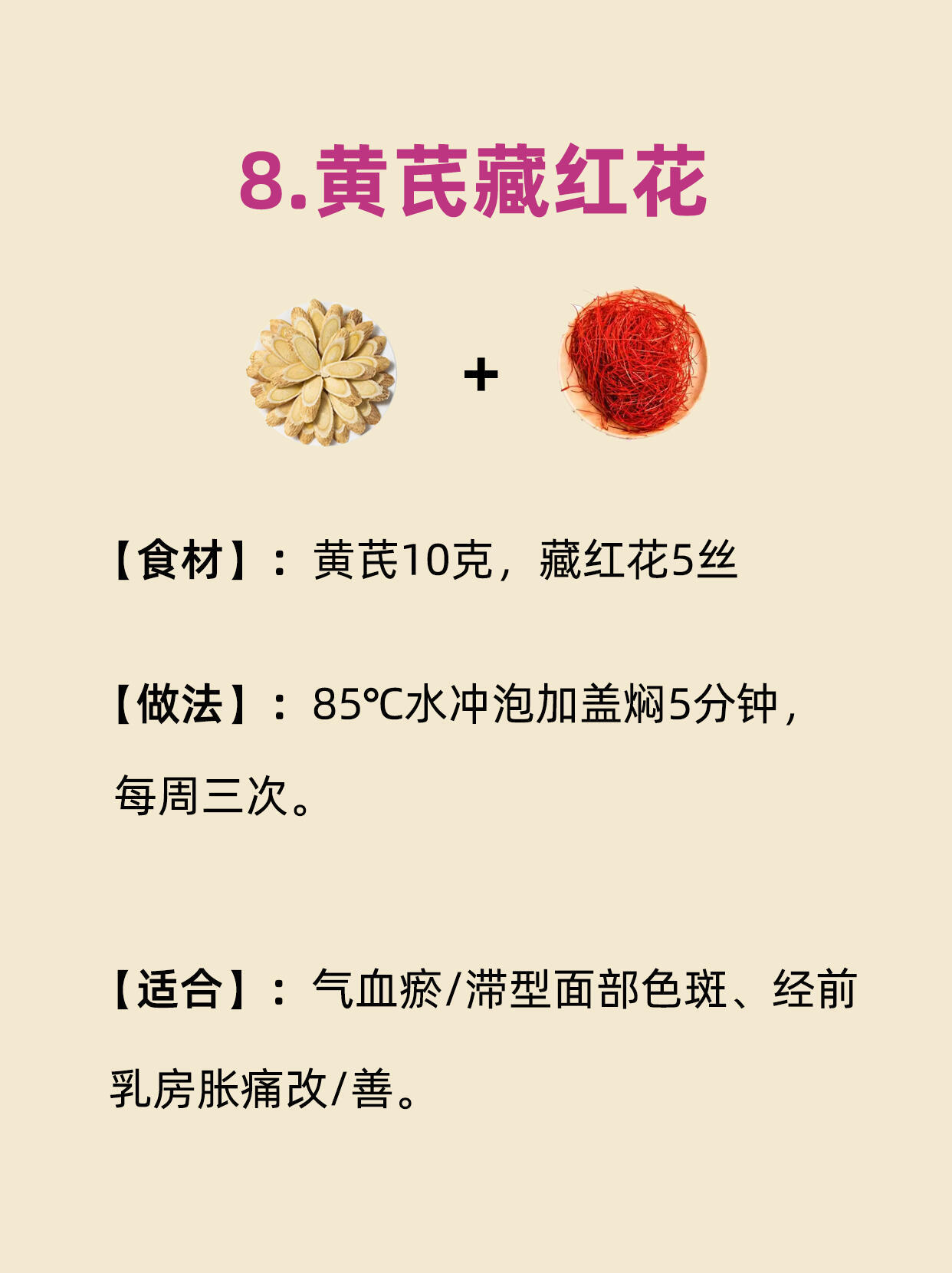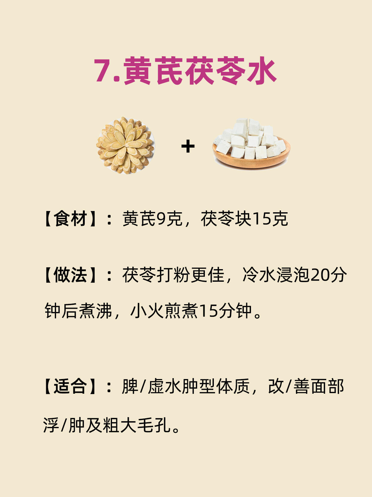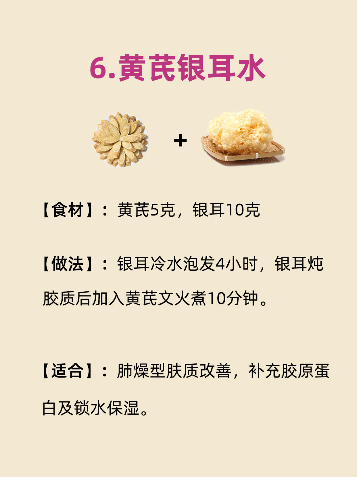 暗黄、熬夜脸、上妆卡粉?你可能不是缺护肤品,而是缺「内养气血」!黄芪作为“补气界顶流”,搭配不同食材能唤醒皮肤通透感~整理9种保姆级喝法,喝出妈生好气色![一]黄芪8克,玫瑰花5朵 沸水冲泡后加盖焖泡8-10分钟,每日上午饮用[二]黄芪10克,红枣5颗(去核切片),清水煮沸后转小火慢炖15-20分钟滤渣[三]黄芪9克,枸杞10克,95℃热水冲泡,可反复续水3-4次饮用[四]黄芪10克,桂圆肉6克(去核),隔水炖盅蒸制30分钟,连汤带肉食用[五]黄芪12克,当归片3克(酒炙),砂锅煎煮25分钟后滤渣,经后连服5天[六]黄芪5克,银耳10克(冷水泡发4小时),银耳炖出胶质后加入黄芪文火煮10分钟[七]黄芪9克,茯苓块15克(打粉更佳),冷水浸泡20分钟后煮沸,小火煎煮15分钟[八]黄芪10克,藏红花5丝,85℃水冲泡加盖焖5分钟,每周三次调理[九]黄芪6克,百合干12克,养生壶煮30分钟加槐花蜜,睡前温服坚持喝一个月黄芪水,你会来感谢我的!谢谢各位点赞收藏关注!你还有什么好方法,评论区来说说!健闻登顶计划国医的精诚力量武医张鹏