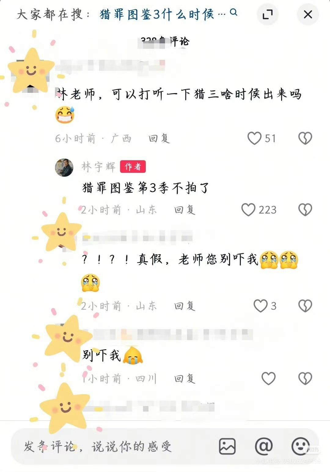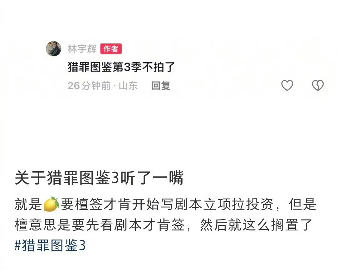 林宇辉回网友评论时候说:檀健次的《猎罪图鉴3》不拍了。