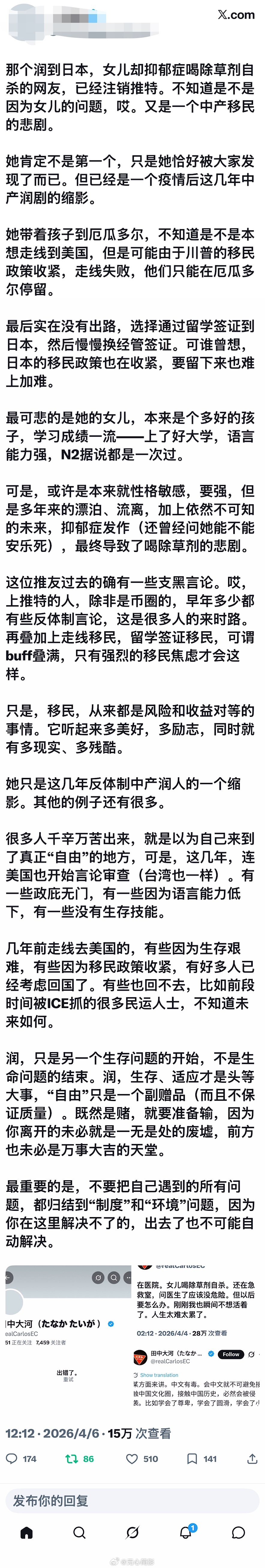 那个润到日本,女儿却抑郁症喝除草剂自杀的润人,已经注销推特账号。这些润人过苦点是