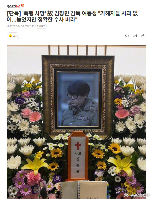 【韩国导演被当众打死加害者还没道歉 】韩国导演被当众打死加害者还没被拘留 据韩媒6日报道,被当众殴打致死的韩国导演金昌珉的妹妹接受采访,透露加害者目前还没有道歉,也没有联络他们。在接受警方的调查时,他们也说明过因为和加害者们生活在同一地区内,担心会再受到伤害。而加害者们却因“没有逃跑的理由”,没有被拘留。