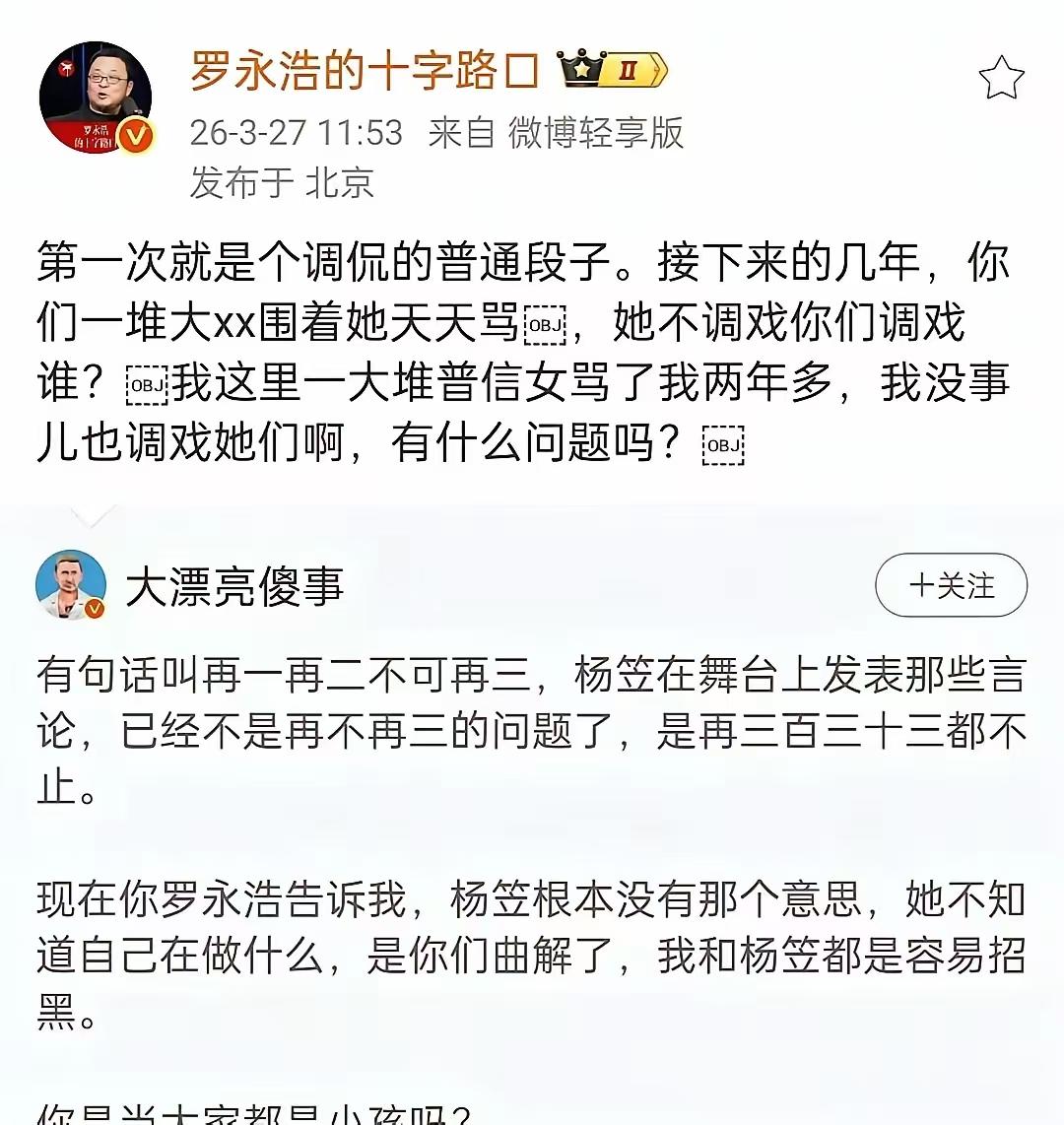 罗永浩曾说过,他退休后要去日本养老。就因为这句话,以后见到罗直播卖东西就划过去,坚决不买罗的任何东西。 什么样的家庭,记得看新闻他爹还是当官的。 罗永浩你去日本吧,不要赖在中国了。 赚中国人的钱到日本去花,这种人我们是不欢迎的。 从来不买罗永浩卖的东西,管他那里养老,妥妥童言无忌! 天狂必有雨,人狂必有祸,这家伙现在不知道自己是谁了。 挺好,到时候估计日本日元贬的一文不值,人民币在那边很值钱,不过就是吃饭生活得清苦点,一碗米饭,一碗纳豆了。 一边抱怨这社会的不公,还一边维护这社会,不知道你们咋想的,买任何东西是根据自己的需求不是根据什么人卖,任何事都不要跟风。 大V的一张嘴谁信谁痛苦,过好自己的生活比什么都好。