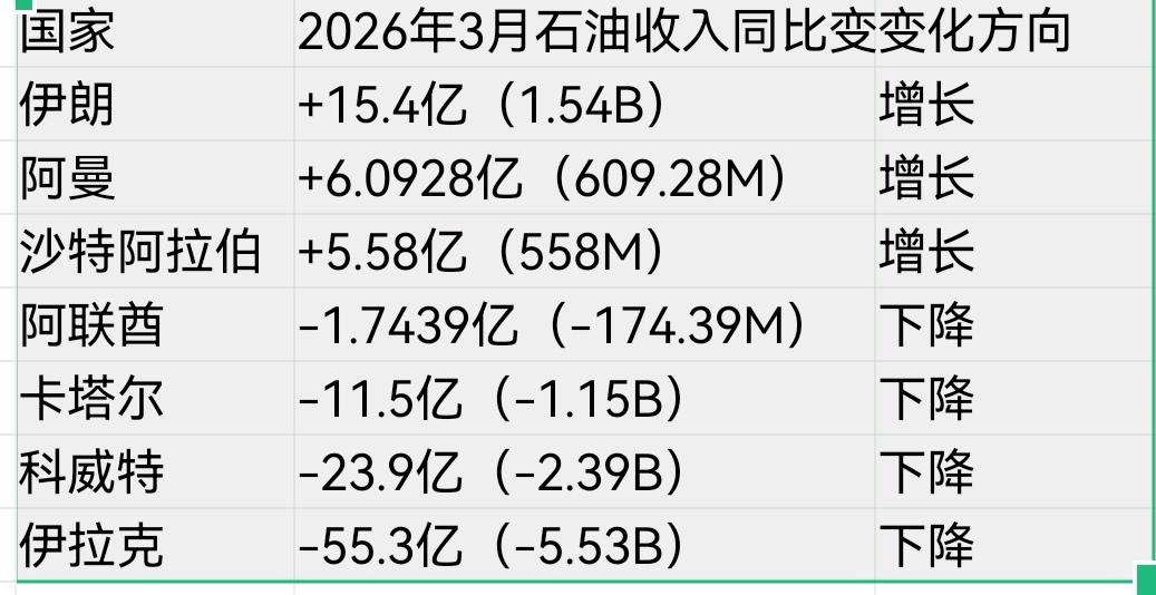 图一是路透社报道的中东产油国家3月份的石油收入情况,为了看得更清楚些,我把它导成了图二的表格。从图表可以看出,伊朗和阿曼因为掌握霍尔木兹海峡的控制权,伊朗和阿曼收入大增(超过25%的增幅),而沙特因为有替代的东西输油管道,所以也实现了小幅增长(4.7%)。而其他中东产油国就没有那么幸运,特别是伊拉克。这些数据可能是短期行为,但也可能预示一种长期的走势,即谁希望战争打得久一点,谁想尽快结束冲突。