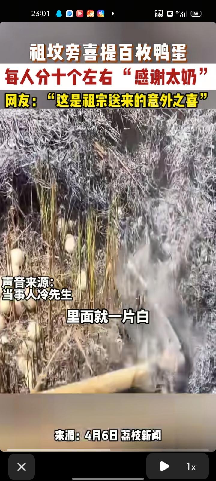 4月6日,江西九江。网友发视频称,清明扫墓时,祖坟旁都是田地,清理杂草后发现坟旁散落着近百枚鸭蛋,笑称“感谢太奶”。随后,一行九人每人分了十个。拿着这份意外收获,大家满心欢喜