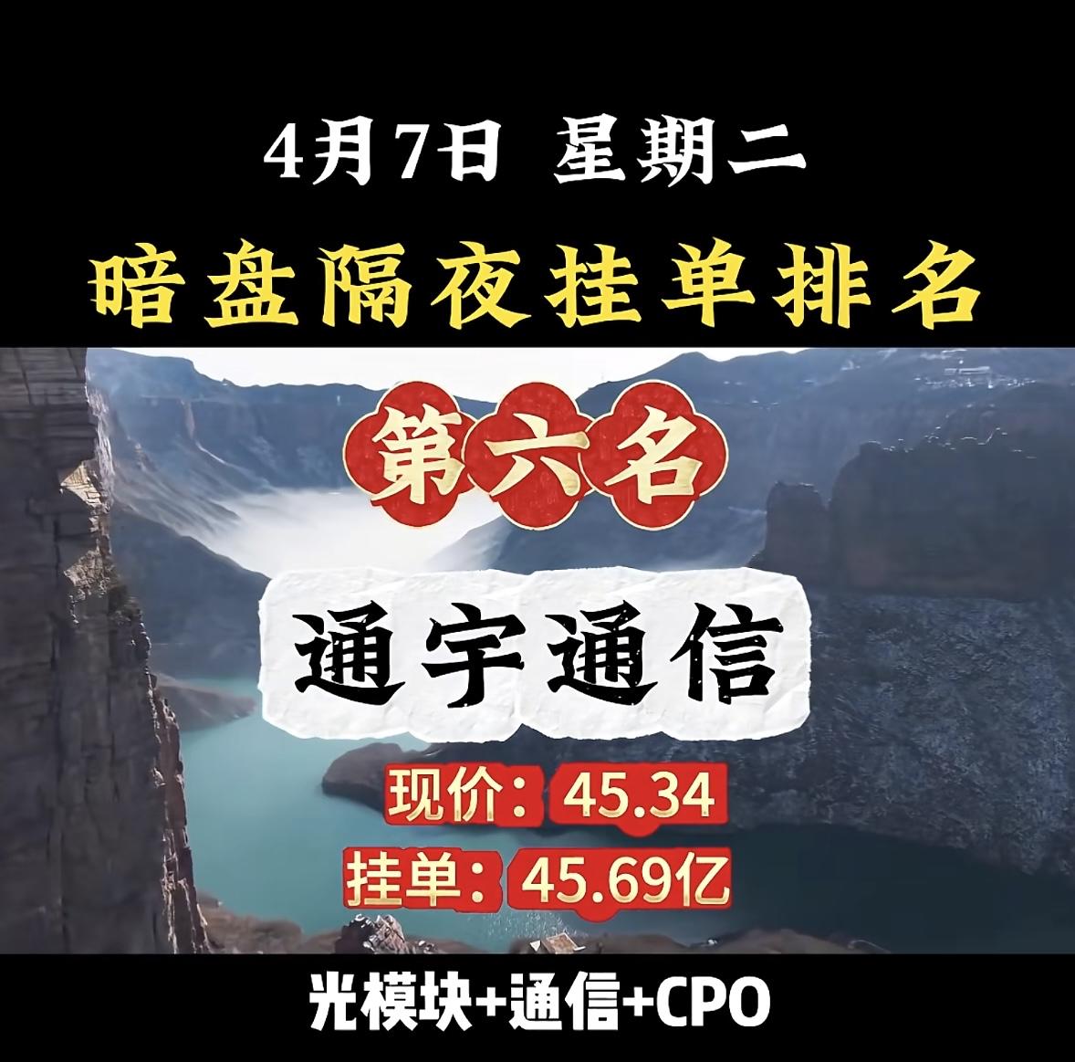 4月7日周二暗盘隔夜挂单排行榜揭晓 4月7日暗盘隔夜挂单排名第六的通宇通信,现价45.34,挂单45.69亿。这挂单数据可不能小瞧,就像3月27日暗盘隔夜挂单数据背后藏着资金布局逻辑一样,通宇通信这么大的挂单量,说明有不少资金在关注它。 不过,从牛叉诊股来看,通宇通信短期处于空头行情,虽可能有短期反弹,但资金呈流出状态,近5日流出9925.06万元。它目前处于回落整理阶段,下跌趋势有所减缓。投资这事儿充满变数,挂单量只是参考,不能直接说股价一定会涨,大家还是要谨慎投资。
