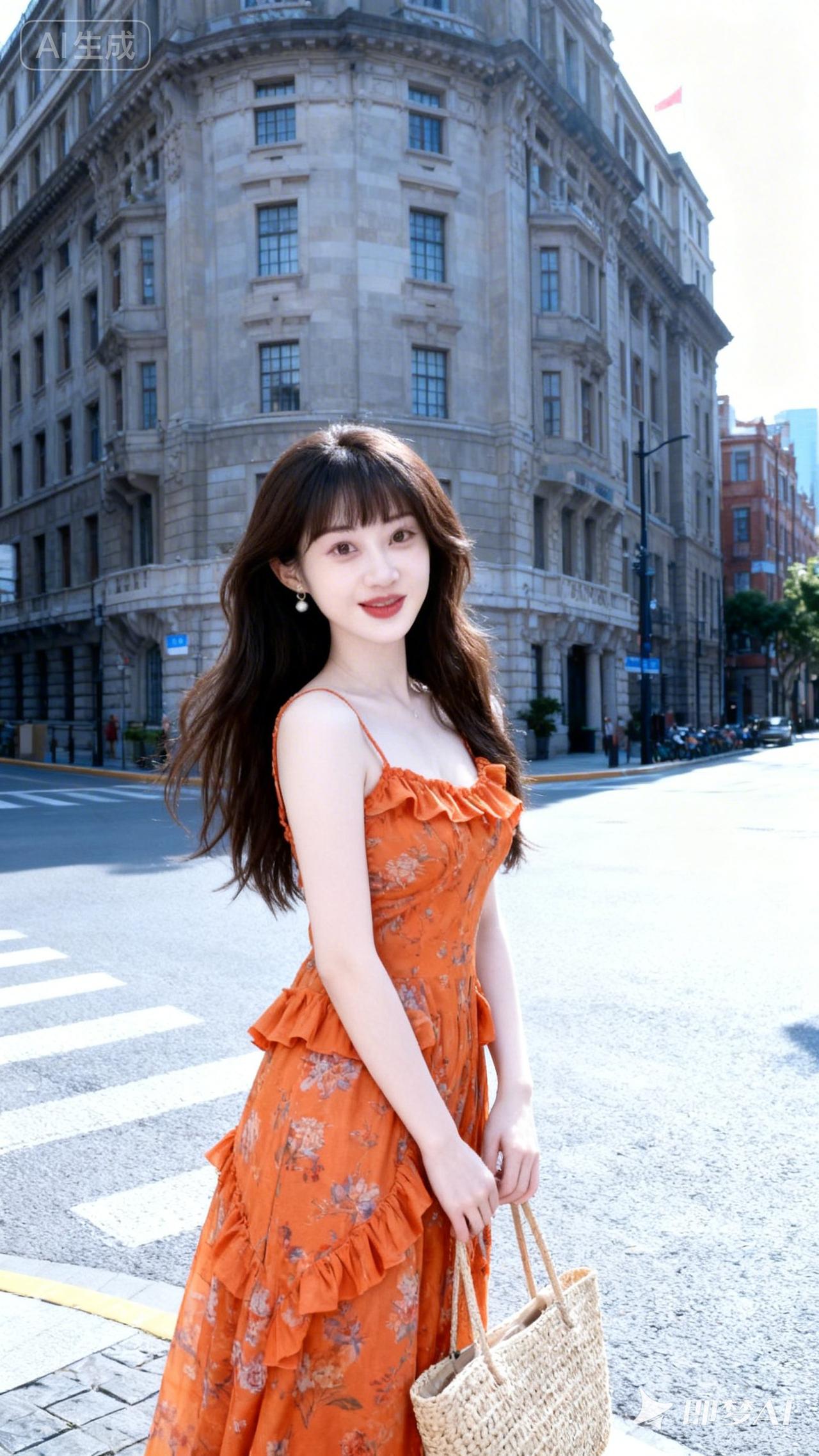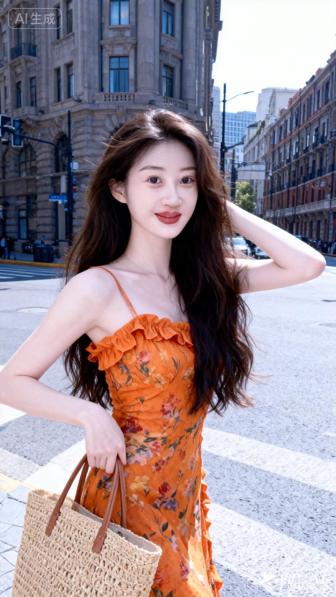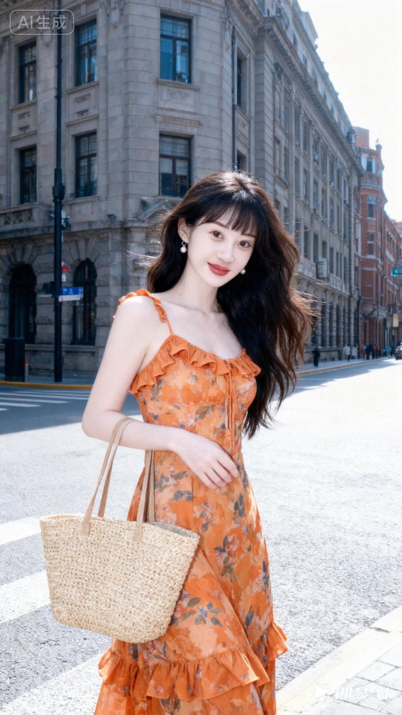 优雅漫步在城市街头,橙花连衣裙与复古建筑相映成趣。