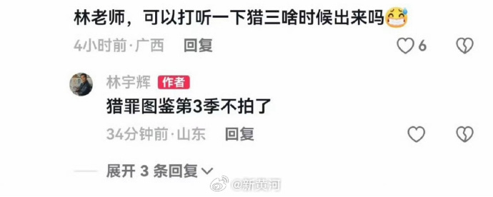 林宇辉再回应猎罪图鉴3停拍【林宇辉说猎罪图鉴3不拍系助理口误】 6日,林宇辉在回复网友时称《猎罪图鉴3》停拍。晚上,林宇辉发文回应:上午发文说猎罪图鉴没有第三部,刚刚发评论说是手机是助理在拿着,没有和剧组核实发表了口误消息。 猎罪图鉴