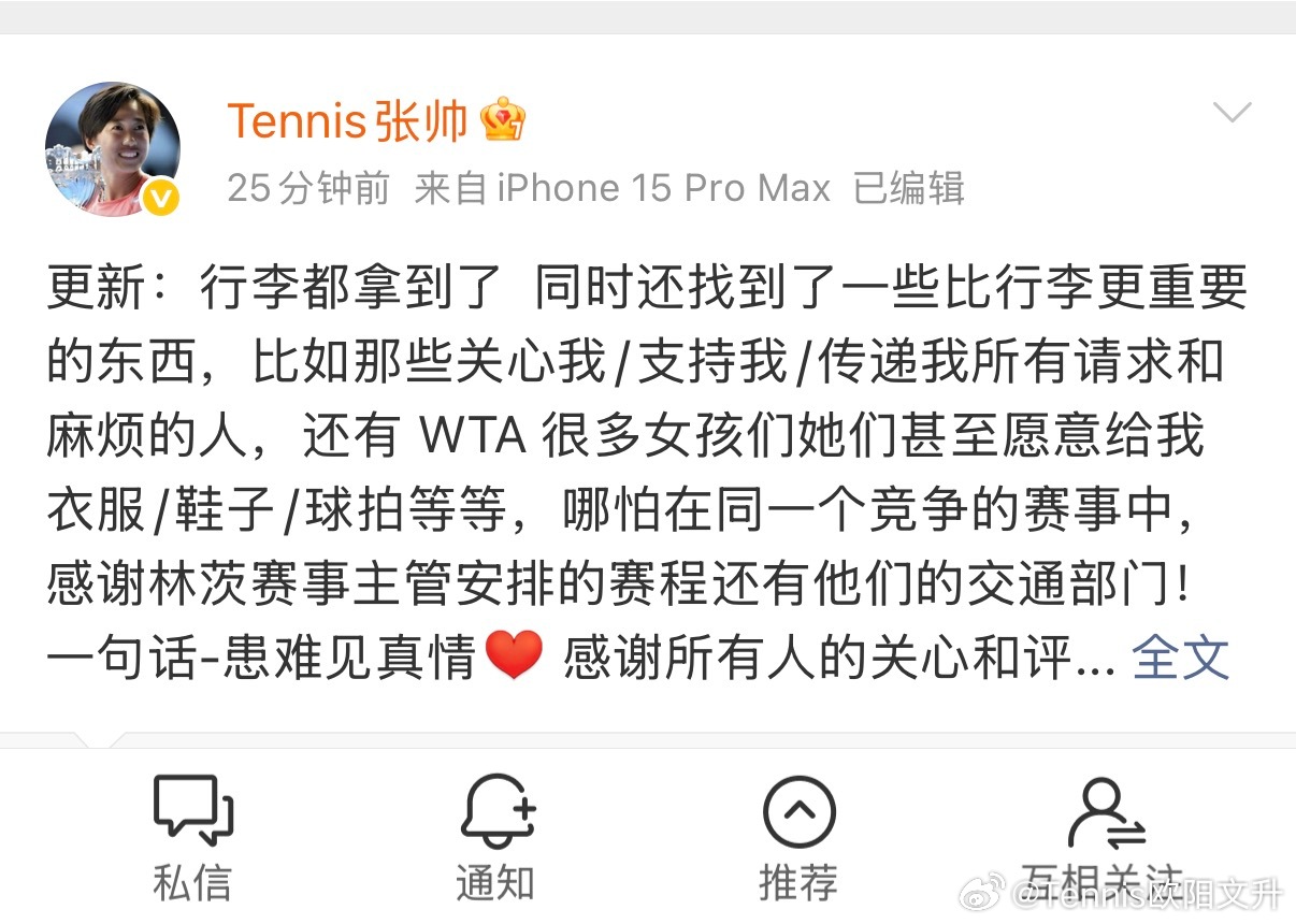 🇨🇳张帅更新行李信息“行李都拿到了”太好了一波三折后可以好好休息下然后出战林
