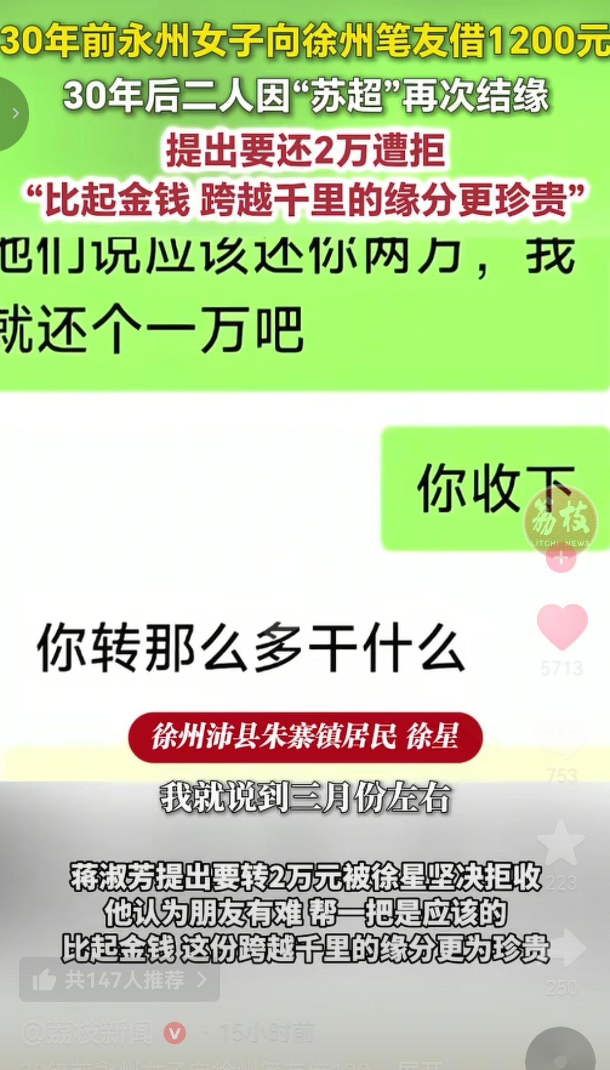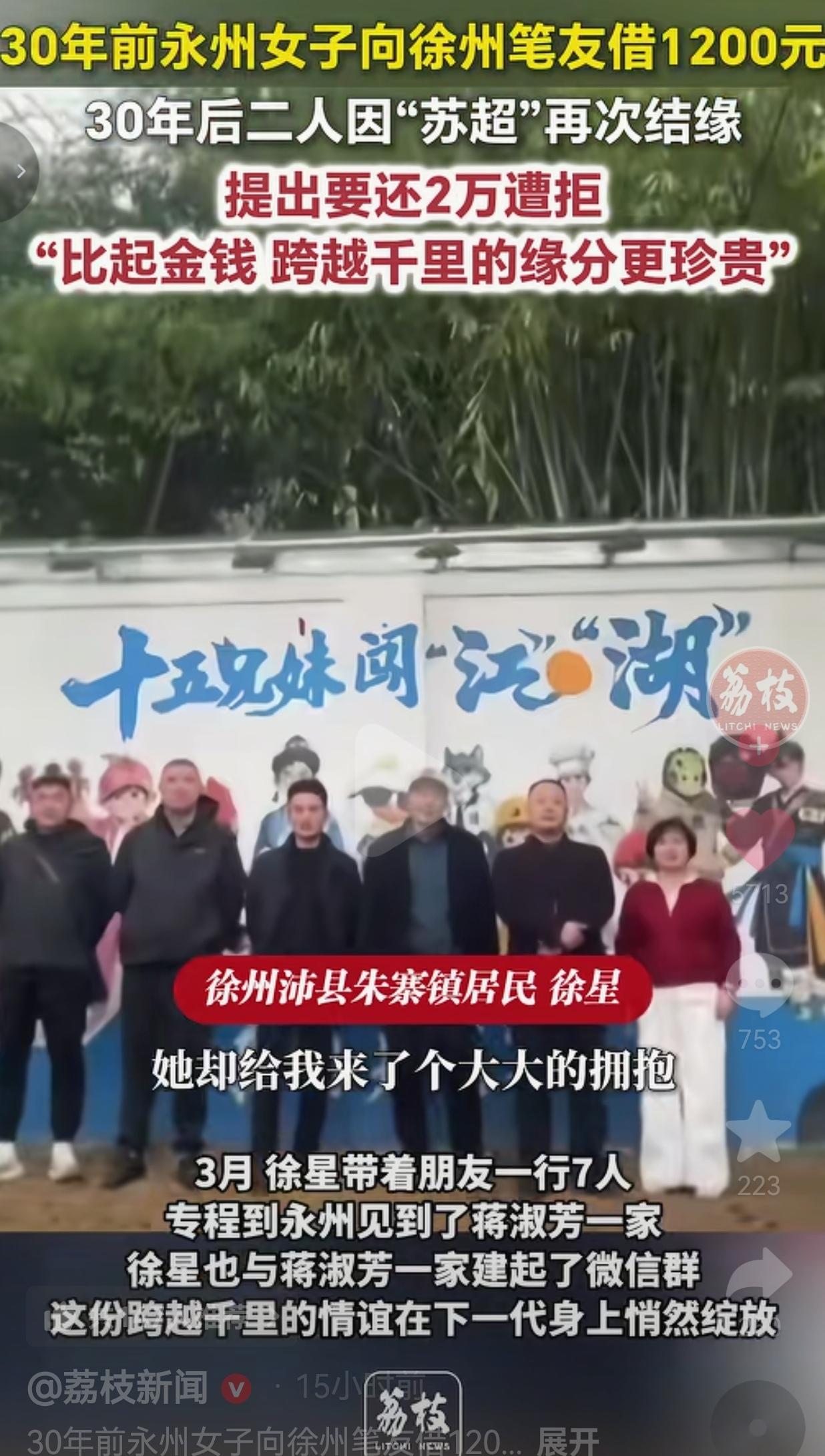 30年前借1200元,30年后还2万被拒!这才是中国人刻在骨子里的善良! 破防了!30年前永州女孩向徐州笔友借1200元救命,30年后苦寻恩人要还2万,结果大哥直接拒收:比起钱,这份跨越千里的缘分更珍贵! 1996年,一本《中外电视》杂志,牵起了湖南永州女孩蒋淑芳和江苏徐州沛县大哥徐星的笔友缘分。 那时候没有手机、没有微信,全靠一封封手写的信,两个素未谋面的年轻人,成了彼此最信任的远方朋友。 认识半年左右,蒋淑芳家里出了难处,中专学费凑不齐,急得直哭。她抱着试一试的心态,给徐星写了一封信,开口借钱。 换作现在,隔着千里、素未谋面,谁敢随便借钱?可徐星看完信,二话不说,直接给蒋淑芳汇了1200元!在90年代,这可不是小数目,足够一个普通家庭大半年的生活费! 就是这1200元,硬生生帮蒋淑芳撑完了中专学业,改变了她的人生。 可造化弄人,1998年毕业后,两人因为各种原因,彻底断了联系,这一断,就是整整30年。 这30年里,蒋淑芳从来没忘记过这份恩情。她无数次想找徐星,可只记得他是徐州沛县人,茫茫人海,根本无从下手。 直到今年,江苏苏宁和湖南湘涛的足球赛,让两地网友彻底热络起来,蒋淑芳抱着最后一丝希望,在网络上发帖寻人。 没想到,真的找到了!徐星现在在沛县开了一家车行,日子过得安稳踏实。 蒋淑芳激动得不行,第一时间就要给徐星转2万元,说这是当年1200元的利息,是她欠了30年的心意。 可徐星直接把钱退了回来,说什么都不收:“朋友有难帮一把是应该的,不用还了!我三月份去你那,你请我吃顿饭就算了!” 今年3月,徐星带着7个朋友,千里迢迢从徐州开车到永州,和蒋淑芳一家见了面。 30年未见,两人一见面就紧紧拥抱,没有丝毫生疏,只有久别重逢的热泪。徐星还和蒋淑芳一家建了微信群,这份跨越千里的情谊,直接延续到了下一代身上! 有网友说: 我的天!这是什么神仙笔友!30年前敢借1200,30年后敢还2万,大哥还直接拒收!这才是真正的善良,刻在中国人骨子里的善良! 也有的网友说: 破防了破防了!现在的人借1200都能把你拉黑,人家30年前借出去,30年后还不要!这才是人与人之间最纯粹的信任! 还有的网友说: 太好哭了!那个年代的笔友真的太纯粹了,没有利益,只有真心!蒋淑芳知恩图报,徐星仗义疏财,双向奔赴的善良太好哭了! 更有网友表示: 羡慕了!我也想有这样的笔友!现在的人都太现实了,再也没有这种跨越千里、纯粹到极致的情谊了! 说实话,我看完这个故事,直接泪目了! 现在这个社会,谈钱色变,别说30年前借1200,就是今天借你1200,能按时还的都没几个!更别说30年后主动还2万,还被恩人拒收! 徐星是什么人?是那个年代最纯粹的好人!他借钱的时候,根本没想着要还,就是单纯觉得朋友有难,必须帮!他帮的不是1200元,是一个女孩的人生,是一份沉甸甸的信任! 蒋淑芳是什么人?是最懂感恩的人!30年,她没忘这份恩,没赖这笔账,拼了命也要找到恩人,加倍奉还!这就是中国人最珍贵的品质:滴水之恩,涌泉相报! 最让我感动的,是徐星说的那句话:“比起金钱,跨越千里的缘分更珍贵。” 在这个人人都向钱看的时代,还有人把人情看得比钱重,还有人相信跨越千里的笔友情谊,还有人愿意用30年的时间,守护一份纯粹的善意! 这才是我们中国人的根!这才是我们该传承的东西! 这个故事,从来都不是1200元和2万元的故事,而是信任、感恩、善良的故事。 30年前,徐星用1200元,给了蒋淑芳一个未来;30年后,蒋淑芳用2万元,给了徐星一份心安。他们用30年的时间,证明了这个世界上,真的有超越金钱、跨越千里的纯粹情谊。 在这个快节奏、高利益的时代,我们见多了借钱不还、见利忘义,可这个故事,就像一束光,照亮了我们心里最柔软的地方。 它告诉我们:善良永远不会过时,感恩永远不会褪色,人与人之间最珍贵的,从来都不是钱,而是那份真心换真心的情谊。 最后,我想说的是:善良遇见感恩,就是世间最美好的双向奔赴!