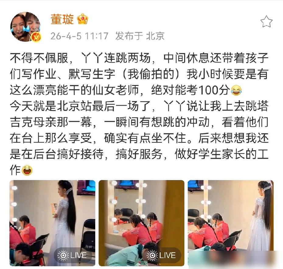 丈夫双双“翻车”后,她把闺蜜女儿当亲生养。 董璇悄悄举起手机,拍下这一幕。佟丽娅穿着白色纱裙,头上的发饰都没摘,弯着腰给两个孩子听写生字。一个是她亲儿子朵朵,另一个,是董璇的女儿小酒窝。 很多人只羡慕她们20年的友情,却忘了她们曾前后脚踏进同一条河。一个为丈夫的官司耗尽心力,一个在婚姻里独自煎熬。最终,都散了。 破碎的家庭,却拼出了一个更完整的家。孩子们从小一起长大,住一个小区,上一个班。小酒窝张口就喊“丫丫妈妈”,这份亲昵,装不出来。 当年董璇最难的时候,是佟丽娅二话不说转账。现在,这份情,全还给了孩子。她说,学习要好,跳舞也要好。哪是什么仙女老师,分明是另一个妈。 真正的家人,是帮你托底,而不是让你触底。