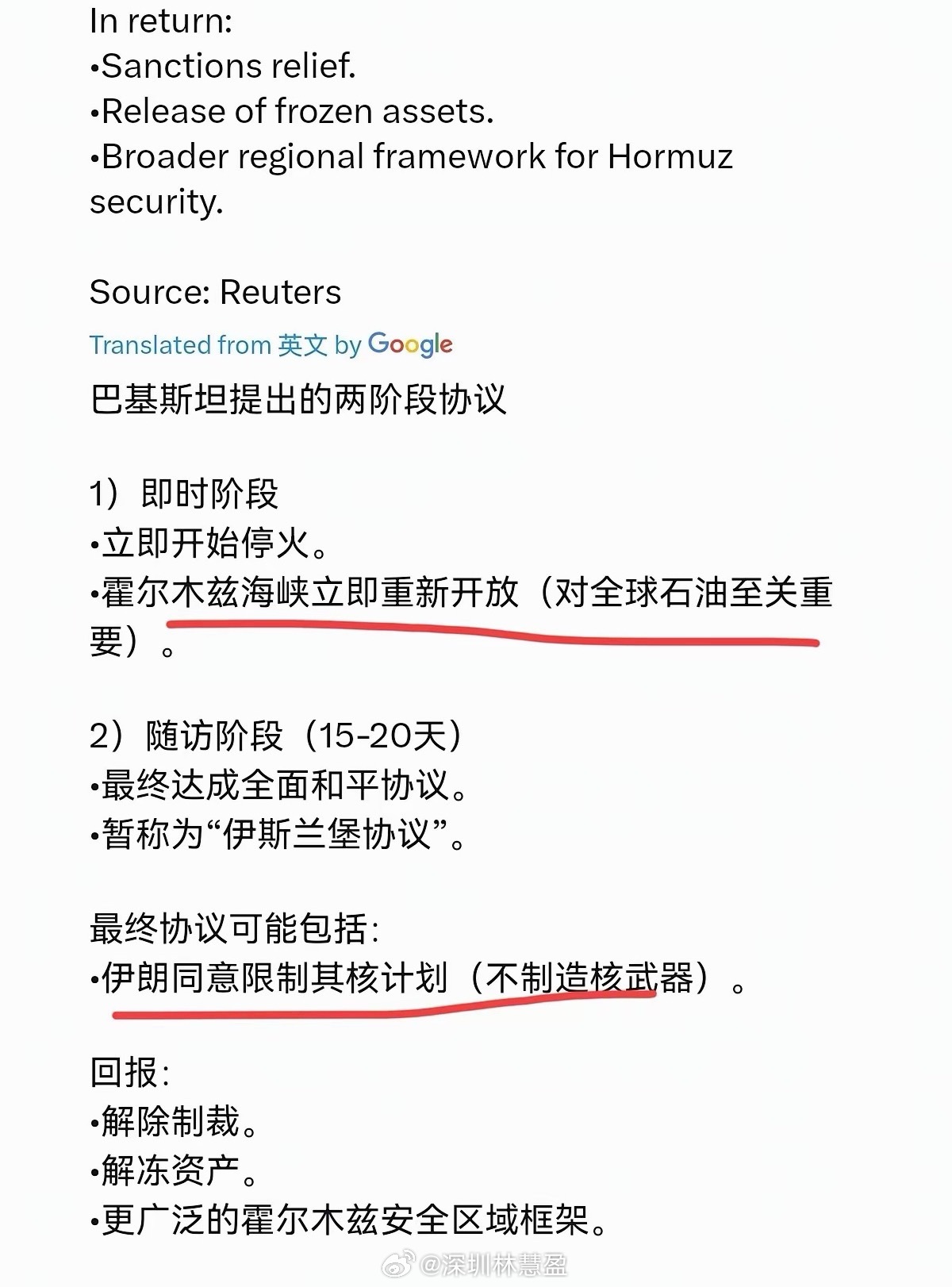 美伊进行谈判了!双方谈判条件曝光!4月6日,根据外媒报道,在巴基斯坦的斡旋下,美国与伊朗进行了接触。巴基斯坦提出的两阶段协议,第一阶段,美国的条件是,停火立即开始,霍尔木兹海峡立即重新开放(全球石油的关键)。第二阶段是,未来15-20天,最终达成全面和平协议。包括:伊朗同意限制核计划(无武器)。而作为回报,美国解除制裁,释放被冻结的伊朗资产,更广泛的霍尔木兹安全区域框架。而此次美国方面由美国副总统万斯与伊朗接触谈判。很显然,美国之所以愿意坐下来谈,甚至接受伊朗点名的谈判人选万斯,根本原因当然不是美国开始“爱好和平”了,而是现实已经逼得它不得不谈,再耗下去损失特朗普根本扛不住。油价,选情,内部反对,特朗普都不能不考虑。这也说明,特朗普是真的不敢考虑地面战争这一选项。当然,美伊双方谈归谈,但是能不能谈成,谈成之后,美国能不能遵守协议,还存在极大的变数。不过,伊朗现在是光脚的不怕穿鞋的,伊朗耗得起,美国耗不起。美国要打,伊朗肯定奉陪。显然,伊朗现在终于明白,当初贸然发动战争,确实是一个错误的决定。