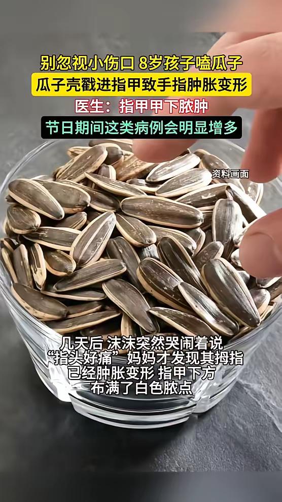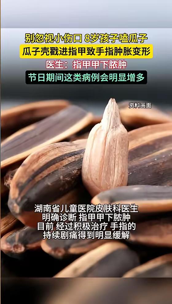 “悲剧还是发生了!”近日,湖南,一女孩和家人嗑瓜子,一枚尖锐的瓜子壳突然戳进女孩的指甲里面,家人以为只是小问题,便没多管,结果几天后,女孩的手指肿胀变形,并且下方布满了白色脓点,疼得女孩哇哇直哭!网友:家长太粗心了!   最近在湖南,一件让人既心疼又揪心的事刷爆了网络,主角是一个8岁的小女孩,大家都叫她沫沫(化名),本来一家人围在一起嗑瓜子、唠家常,多温馨的场景,谁能想到,意外就这么突然来了。   当时沫沫正跟着家人一起嗑瓜子,小孩子心性,一边玩一边嗑,没注意手里的瓜子壳有多尖锐,突然,一枚尖尖的瓜子壳,一下子就戳进了她右手拇指的指甲里。   沫沫当时愣了一下,跟家人说还好,不怎么疼,家里人看孩子没哭没闹,也没当回事,觉得就是个小划伤,擦一擦就过去了,压根没放在心上。   可谁能料到,就是这个被所有人忽视的小伤口,在短短几天里,竟然发展成了大麻烦。戳伤的第二天,沫沫的指甲上就出现了一个针尖大小的小白点,可她还是没说疼,家人也没留意这个细微的变化,再次错过了最佳的处理时机。   直到三四天后的一天,沫沫突然哇哇直哭,一个劲喊指头好痛,这时候家人才慌了神,赶紧拿起孩子的手一看,瞬间就懵了。   沫沫的右手拇指已经肿得变形,指甲下面布满了密密麻麻的白色脓点,还夹杂着好几处淤血,轻轻一碰,孩子就疼得浑身发抖,哭得更厉害了。   心急如焚的家人不敢再耽误,赶紧带着沫沫去医院就诊,经过医生检查,确诊是指甲甲下脓肿,说白了就是瓜子壳戳伤后引发的继发性感染。   医生说,这种情况在节日期间特别常见,尤其是孩子,对疼痛的耐受度和表达能力都有限,初期症状不明显,很容易被家长忽视。   一开始医生给沫沫用了外用的抗感染药物和口服抗生素,可症状并没有明显缓解,后来医生调整了治疗方案,给她做了臭氧水疗、红光照射,还进行了指甲皮下组织穿刺术,把指甲里的脓液抽了出来,沫沫这才说,手指舒服多了。   网友们看到这件事,都忍不住感慨,家长也太粗心了,其实我倒觉得,不光是粗心,更多的是大家都没意识到,这种看似不起眼的小伤口,竟然能造成这么严重的后果。   瓜子壳看着小,可表面有很多细菌,一旦戳进指甲这种敏感的地方,细菌很容易滋生,加上孩子的指甲比较脆弱,感染起来特别快。   说真的,家里有小孩的一定要注意,嗑瓜子、剥坚果这种事,最好在家长监护下进行,尽量给孩子准备去壳的坚果。   要是不小心戳伤了手指,哪怕孩子说不疼,也一定要及时消毒,仔细检查有没有异物残留,别像沫沫的家人这样,因为一时疏忽,让孩子遭了这么大的罪。   这件事也给所有家长提了个醒,照顾孩子真的不能有半点马虎,那些看似微不足道的小细节,很可能就隐藏着大风险,有时候多一份细心,就能少一份伤害,愿每个孩子都能在家人的呵护下,平平安安长大。