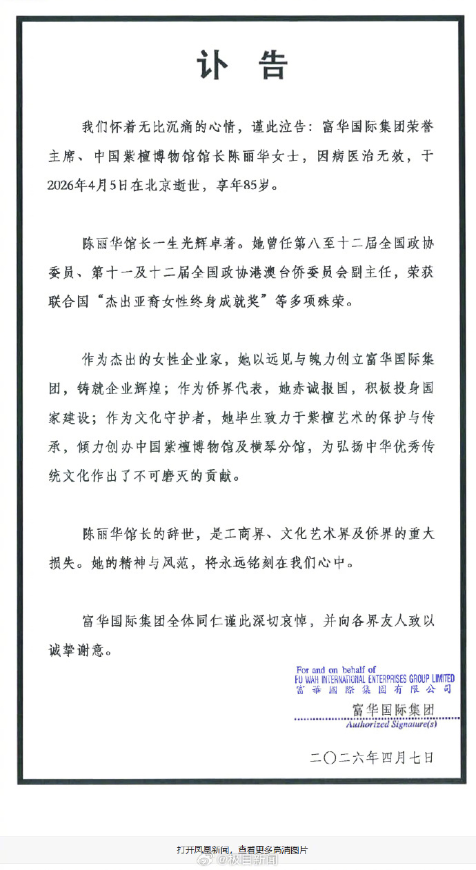 【#陈丽华逝世#】富华国际集团4月7日发布讣告:富华国际集团荣誉主席、中国紫檀博物馆馆长陈丽华女士,因病医治无效,于2026年4月5日在北京逝世,享年85岁。 (中新网)