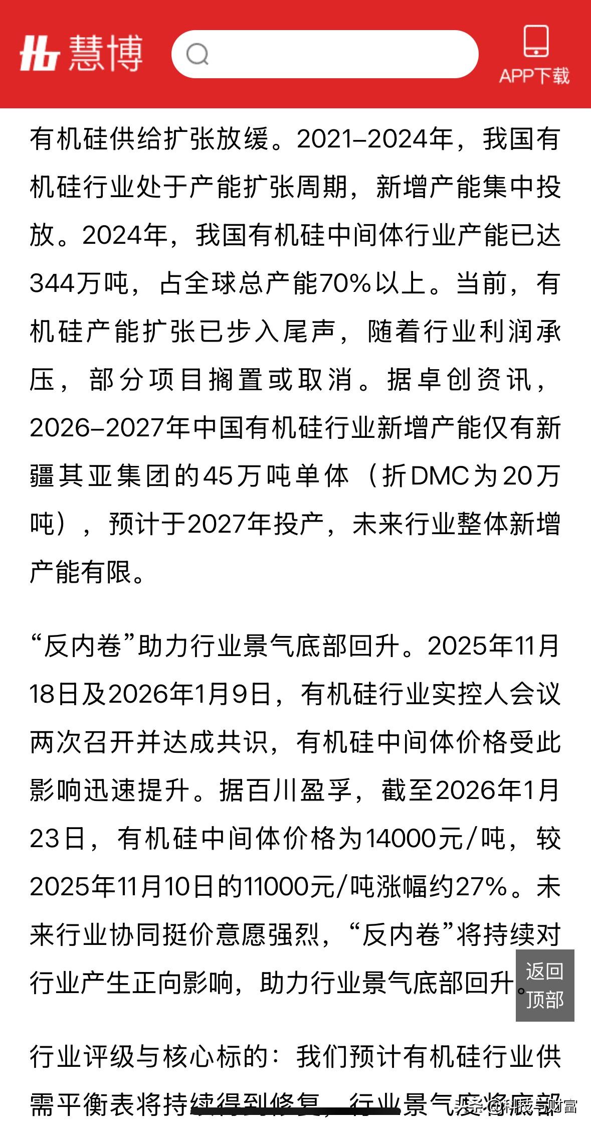 🔥有机硅价格暴涨40%!周期拐点真的来了?多家机构发声,一文看懂产业逻辑 很多人都在问,这一轮有机硅走强,究竟是短期波动,还是行业真正走出低谷? 结合最新机构研报与行业数据,今天用清晰结构,带你看懂这一轮行业变化。 我整合了瑞银证券、湘财证券公开研报观点,以及生意社、百川盈孚实时价格数据,只讲产业逻辑,不做任何投资判断。 一、机构公开观点 1. 瑞银证券:2026年有机硅行业暂无新增产能投放,行业减产控产成为阶段性常态 2. 湘财证券:行业供需格局较前期有所改善,新能源及海外需求为行业带来支撑 3. 行业研究机构:DMC价格自前期低点反弹幅度接近40%,行业盈利状况较此前有所修复 二、行业核心数据与逻辑 供给端:2025年底行业企业达成协同减产共识,2026年3—5月减产比例提升至35%,行业开工率维持在65%左右;海外企业陶氏化学计划关停英国有机硅装置,全球供给结构出现变化。 需求端:有机硅应用于光伏、新能源汽车、电子、建筑等多个领域,传统消费旺季来临叠加海外订单增加,市场需求端出现阶段性回升。 价格端:据生意社、百川盈孚监测数据,当前有机硅DMC主流报价14300-14500元/吨,较前期低点明显回升,行业成本压力得到一定缓解。 三、全球产业格局 我国有机硅产能占全球比重超70%,在全球供应链中占据重要地位。随着海外部分产能退出,国内产业在全球市场中的地位进一步凸显。 长期来看,电子级、医疗级等高端有机硅材料仍存在国产替代空间,技术升级将成为行业长期发展方向之一。 四、行业总结 此轮有机硅价格回升,是供给收缩、需求回暖共同作用下的行业阶段性变化。 行业正逐步走出前期低谷,后续发展仍将受到供需、原材料价格、海外市场等多重因素影响。 ⚠️重要声明: 关注我,本文仅为公开行业资讯、机构研报观点及产业数据整理,属于产业科普内容,不构成任何投资建议,不涉及个股分析与投资指导。市场存在不确定性,相关行业发展亦存在风险,请理性看待。 有机硅 新材料行业 产业科普 行业分析