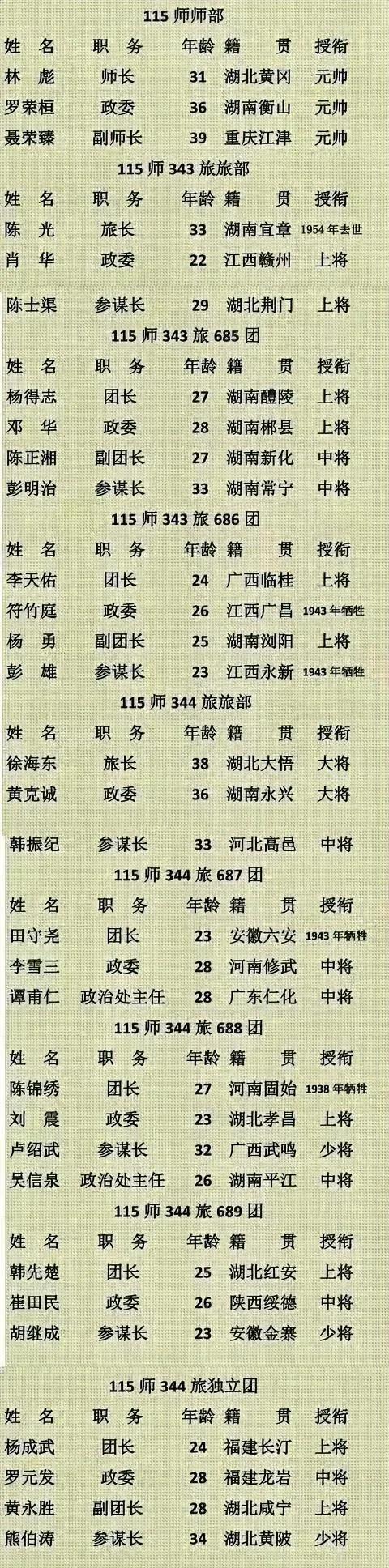 115师成立时,团级以上干部姓名、职务、籍贯、年龄和授衔一览 1937年,红一方面军主力完成整编,正式番号定为八路军第115师,师长林彪,副师长聂荣臻,下辖343旅与344旅。343旅旅长陈光,344旅旅长徐海东。全师官兵1.55万人,编制一成,立即开赴华北战场。 整编完成不过数周,115师就迎来了第一场硬仗。 1937年9月,日军第5师团(板垣征四郎部)长驱直入,目标直指山西腹地的平型关。晋绥军在正面扛得十分吃力,战局危急。 中央军委命令林彪率115师主力进入平型关一线,寻机打击日军侧翼。林彪和聂荣臻亲赴前线勘察,在平型关东北方向找到了一条叫乔沟的古道,两侧是壁立的山崖,狭窄绵长,只要把日军引进来,首尾就无法呼应。 9月24日夜,115师主力冒着大雨,悄悄进入伏击阵地。陈光率343旅下辖685团、686团占据两侧高地,各部严令无令不得开枪。 9月25日清晨,日军第21旅团一部连带大批辎重车队鱼贯而入。等车队完全进入乔沟,林彪下令开火。日军顿时陷入混乱,车队堵死了退路,前后无法支援。 115师官兵从高处俯冲而下,刺刀见红。这一仗打了整整一天,歼灭日军逾千人,击毁车辆数百辆,缴获物资堆满了山沟。 平型关之后,115师声名大震,但这支部队随即遭遇了一次意想不到的变故,几乎让整个指挥体系陷入瘫痪。 1938年3月初,115师师部转移至山西大宁县一带。那几天山里大雾,能见度极差。林彪一早出门勘察地形,身上穿着缴获来的日军将官呢子大衣,骑的是一匹高大的日本洋马。 国民党晋绥军第19军王靖国部的一个哨兵远远看见一骑高马、穿日军军服的人影在雾中缓缓靠近,来不及辨认,直接扣动了扳机。子弹打中林彪右腋,贯穿背部,伤及脊髓神经。 林彪落马,伤势极重。 晋绥军查清真相后急忙致歉,但林彪已经无法继续指挥作战。伤愈后,林彪辗转回延安,随后被送往苏联莫斯科疗养,一去就是数年。 115师主官位置空了出来,中央军委随即任命陈光代理师长,与政委罗荣桓搭档,主持全师军务。 陈光接手之后,局面并不轻松。1938年底,毛泽东在六届六中全会上明确提出要派兵进山东,在日军后方建立根据地。 1939年初,陈光与罗荣桓率师部及主力部队渡过黄河,悄然进入山东泰安、肥城一带。 日军第12军发现八路军主力进入山东腹地,调集第114师团等部共八千余人,携带炮车坦克,向泰西地区合围而来。 1939年5月11日,陈光所率的师部、686团(团长杨勇)、津浦支队及地方机关干部,共计三千余人,被日军团团困在肥城以南的陆房村。 陆房四面环丘,地形对被包围一方极为不利。 陈光站在山包上扫了一眼地形,当机立断,令686团抢占肥猪山和岈山两处制高点。 日军当天发起了十多次集团冲锋,炮弹把山头炸得碎石横飞,阵地几度告急,官兵用刺刀顶住了一波又一波的进攻。僵持到黄昏,日军伤亡已逾千人,攻势渐缓。