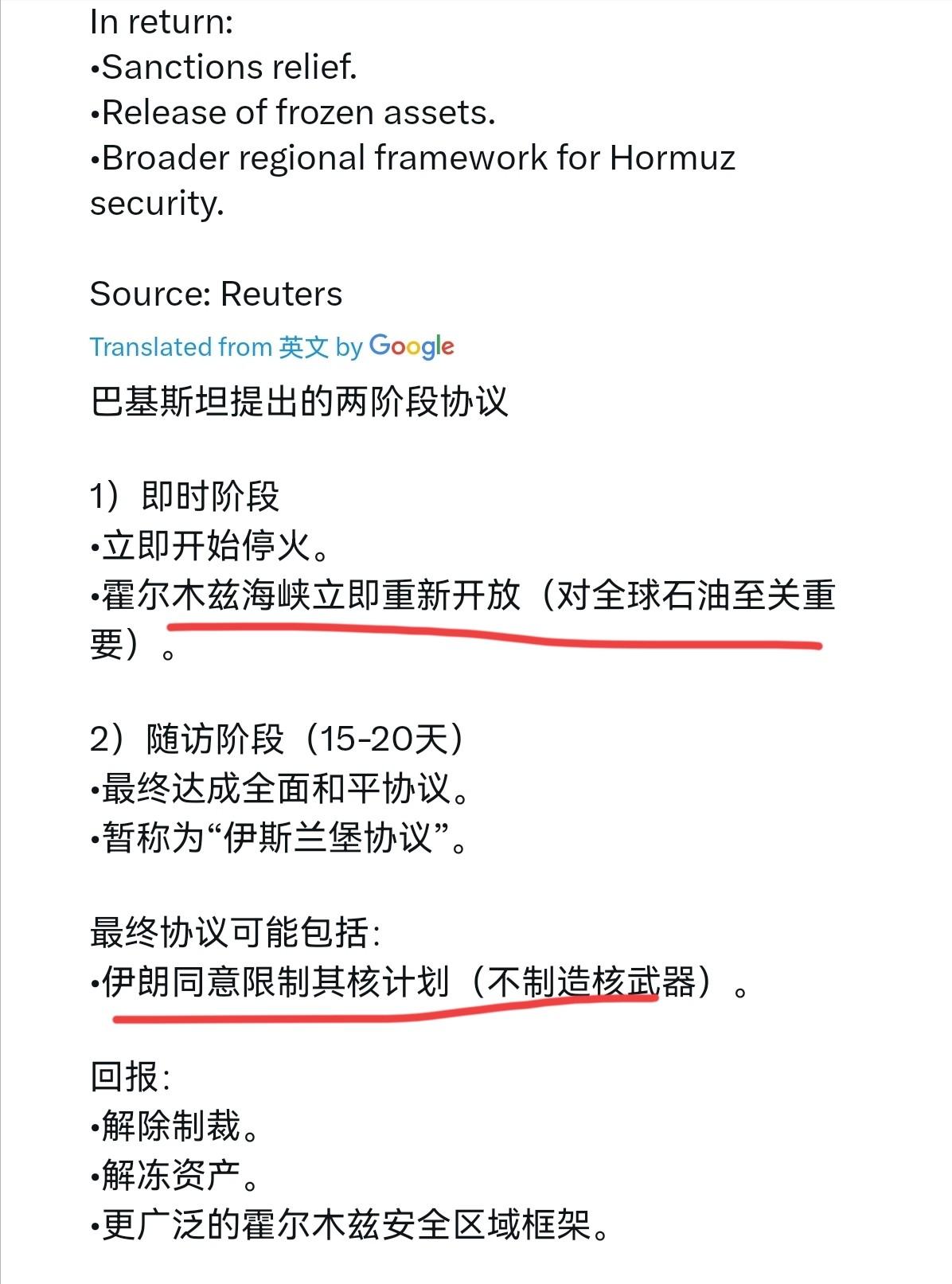 美伊进行谈判了!双方谈判条件曝光!4月6日,根据外媒报道,在巴基斯坦的斡旋下,美国与伊朗进行了接触。巴基斯坦提出的两阶段协议,第一阶段,美国的条件是,停火立即开始,霍尔木兹海峡立即重新开放。第二阶段是,未来15-20天,最终达成全面和平协议。包括:伊朗同意限制核计划。 有人会问,巴基斯坦咋突然成中间人了?其实人家也不是临时凑数,据消息人士透露,巴基斯坦早就拟定了一套结束双方敌对行动的框架,还专门让陆军参谋长阿西姆·穆尼尔,跟美国副总统万斯、伊朗外长阿拉格齐彻夜沟通,就是想把这事促成。 重点来了,巴基斯坦提出的是两阶段协议,咱们通俗点说,就是先解决眼前的急事,再谈长远的和平。第一阶段,美国的条件很明确,俩要求:一是停火必须立即开始,不能再打了;二是霍尔木兹海峡必须马上重新开放。 可能有人不知道霍尔木兹海峡有多重要,说白了,它就是全球石油的“命门”!国际能源署3月份刚出的报告显示,2025年一年,每天大概有2000万桶原油和成品油从这过,占了全球海运石油贸易总量的四分之一,除此之外,全球五分之一的液化天然气也得从这运输,像卡塔尔、阿联酋这些海湾国家,出口天然气全靠这条通道。 更关键的是,亚洲国家对它的依赖度高到吓人,日本通过这航道进口的原油占比90%,韩国更是达到了95%,之前这海峡通行受阻,直接导致全球每天原油供应缺口高达1000万到1600万桶,油价跟着疯涨,美国本身就面临滞胀压力,自然急着让它重新开放,不然自己的通胀就真的扛不住了。 再来说第二阶段,按照协议,停火和海峡开放后,接下来的15到20天里,美伊要达成全面和平协议,这里面最关键的一条,就是伊朗要同意限制核计划,明确不研发核武器。 说到这,就得提一嘴伊核问题的来龙去脉,其实这事儿的“种子”还是美国自己埋下的,半个多世纪前,美国为了在冷战中跟苏联竞争,主动给伊朗提供核技术,还培训核人才、给核反应堆,结果后来美伊关系闹掰,美国又反过来制裁伊朗,不让人家搞核,伊朗不服气,就偷偷重启核计划,这一闹就是几十年,双方的矛盾也越积越深。 不过大家也别太乐观,这谈判能不能成,还真不好说。美国《华尔街日报》6号就报道了,调解方对这事都挺悲观的,说美伊双方的立场差距太大,难以缩小,而且美国还设了最后期限,要是伊朗不妥协,可能还会动手。 更有意思的是,伊朗那边也有顾虑,据熟悉情况的阿拉伯国家官员说,伊朗官员已经告诉调解方,就算谈判有进展,他们也担心美国和以色列会继续袭击他们,毕竟之前伊朗不少高级官员都遭过袭击,通信基础设施也被破坏,现在美国连跟伊朗哪方面的人谈、怎么联系,都没完全确定。 还有个关键点,目前不管是美国还是伊朗,都还没对这份谈判方案作出正式回应,巴基斯坦外交部发言人也拒绝置评,所以现在这一切都还处于“暂定”状态。 其实说白了,美伊这次谈判,都是各有各的算盘:美国急着让霍尔木兹海峡开放,缓解油价上涨带来的通胀压力,也想尽快结束跟伊朗的敌对状态,毕竟美国民众对更多军事行动的耐心已经有限了;伊朗则是想通过限制核计划,换取美国解除制裁、解冻被冻结的资产,而且伊朗官员之前也说过,他们一直想达成永久停火协议,保证自己不再受到美国和以色列的袭击。 可能有人会问,巴基斯坦为啥要费力不讨好当这个中间人?其实也不难理解,中东局势不稳定,对巴基斯坦也没好处,而且能促成美伊谈判,也能提升巴基斯坦在国际上的影响力,算是一举两得。 不过话说回来,美伊积怨太深,几十年的矛盾,不可能靠这一次谈判就彻底解决,就算达成了协议,后续能不能顺利执行,也是个大问题。 现在的情况就是,美伊在巴基斯坦的斡旋下,有了接触,也有了明确的谈判框架和条件,但双方立场还有很大差距,能不能谈成还是个未知数。咱们就搬好小板凳,接着看后续发展就行,毕竟这事儿不光关系到美伊两国,还影响着全球的石油价格和中东局势,半点马虎不得。 你们觉得这协议最后能成不?评论区聊聊~