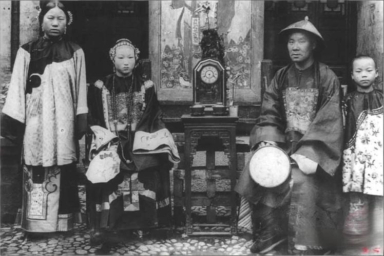 晚清,一户汉族官宦家庭的全家福,照片中的四人,以严格的座次、服饰、姿态,完美复刻了晚清官宦家庭的等级秩序。 右侧就坐的男性是一家之主,朝廷命官,头戴夏季官帽,胸前是方形补子,穿厚底皂靴,手持圆形白色器物,神态威严。左侧就坐的是内宅主母,官员的正妻,朝廷诰命夫人,是内宅的掌权者。 左侧站立的年长女性,大概率为官员的妾室、年长女仆,身穿清代汉族已婚妇女的宽袖大襟长袍,镶边装饰,头饰簪花,右侧站立的孩童应该是官员的嫡子。 中间花几上的欧洲产座钟,是晚清绝对的奢侈品,一台进口座钟的价格相当于普通家庭数年的收入,仅官宦、富商家庭有能力购置;将座钟置于家庭合影的正中,是刻意彰显财富、地位与西化视野的行为,是晚清官宦阶层的炫富方式。