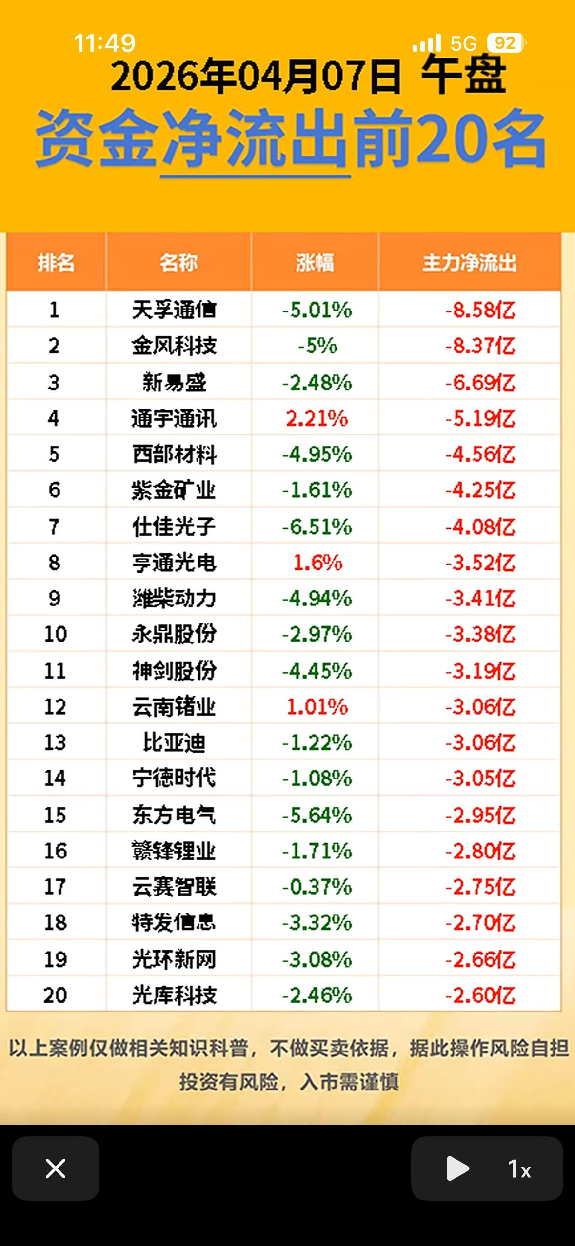2026年4月7日午盘资金净流入与净流出前20名,投资需谨慎! 2026年4月7日午盘A股市场挺有意思。上证指数微涨0.03%到3881.17点,深证成指跌0.2%,创业板指跌0.46%,但超3600只个股上涨,成交额达1.07万亿。三大指数早盘冲高回落,创业板指由涨转跌,上方抛压重。不过涨停个股有70只,说明市场风险偏好没降,资金还在找机会。 商业航天板块冲高回落,航空航天ETF午盘跌0.65%,但二季度有火箭发射和SpaceX IPO路演,全球产业共振预期强,相关ETF已连续5日资金净流入。投资得注意这些资金流向和板块动态,毕竟投资有风险,谨慎为上!