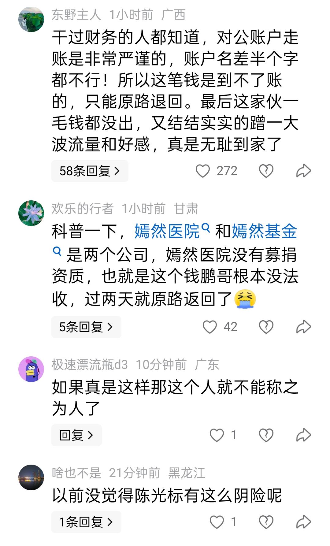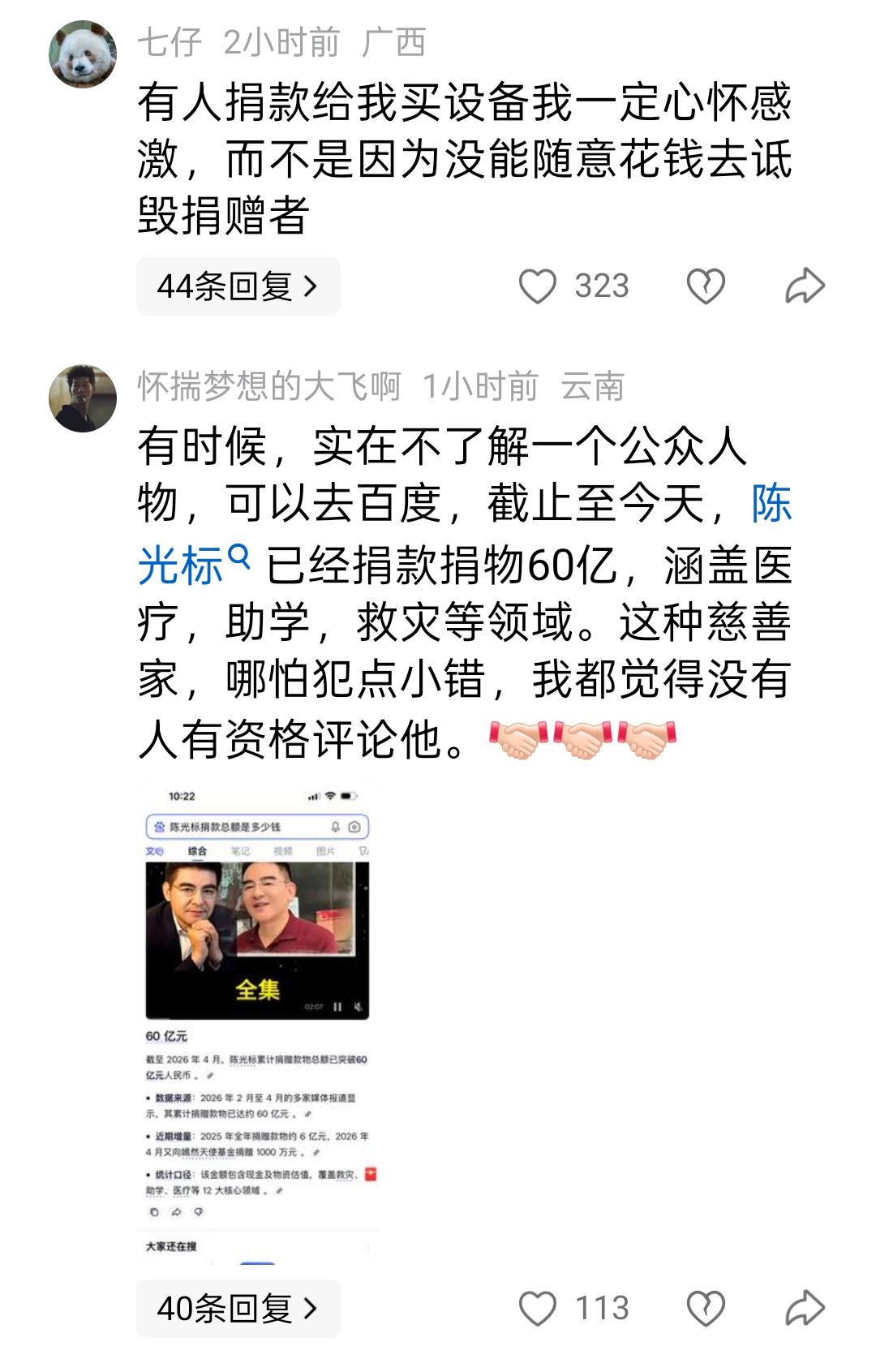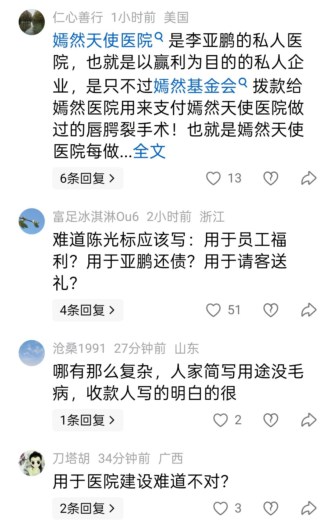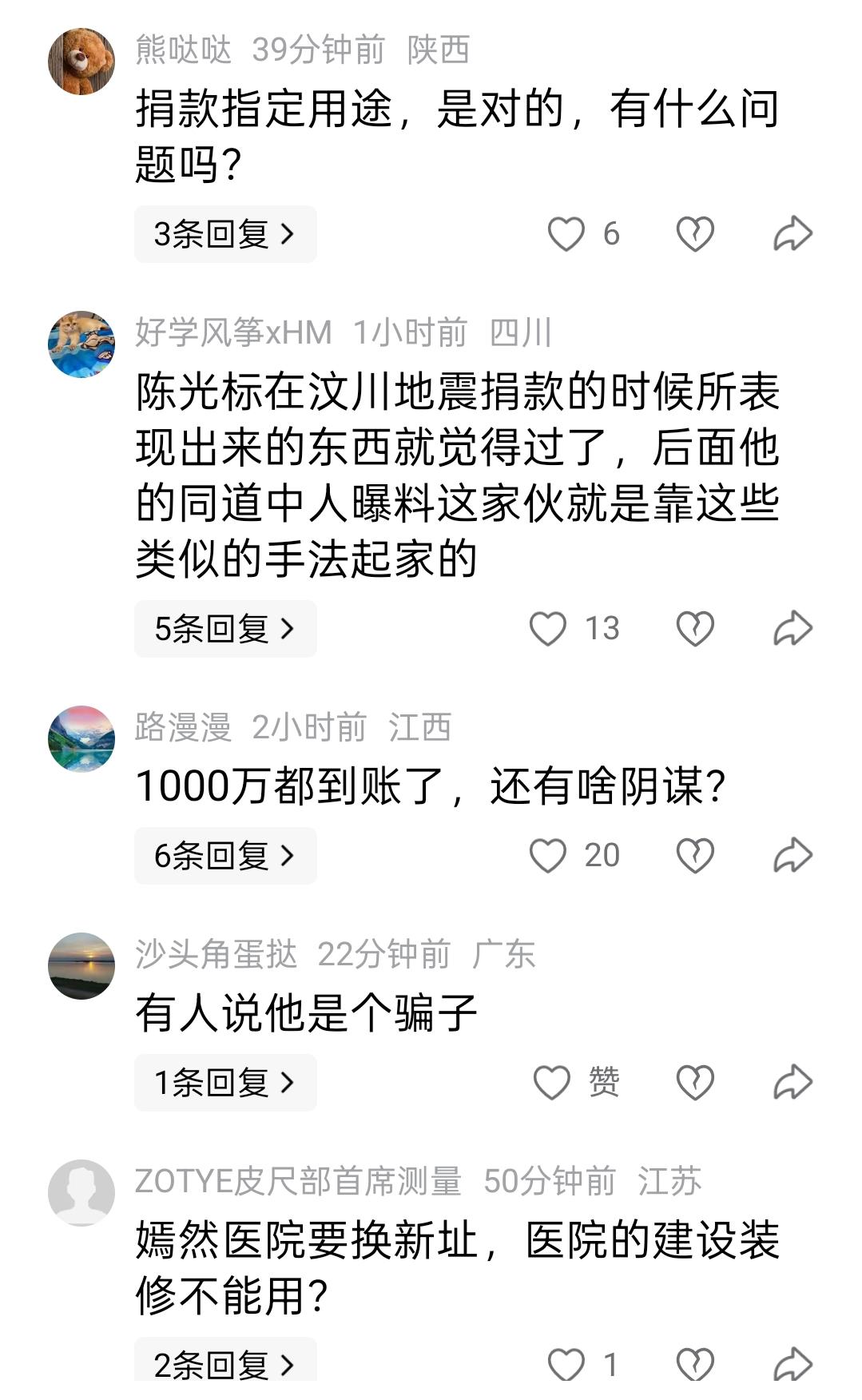 因为陈光标的一张1000万元捐款截图,两拨网友又吵翻了天。 4月1日,为表彰张雪机车在世界超级摩托车锦标赛中夺冠,陈光标宣布向其创始人张雪赠送一辆价值1300万元的劳斯莱斯幻影。 次日,张雪回应称将收下此车,但会将其以八折出售,所得款项全部捐给北京嫣然天使儿童医院。 到了4月5日,由于张雪迟迟未提车,陈光标主动将车辆变现,直接向北京朝阳嫣然天使儿童医院捐赠1000万元用于医院建设,此举也得到了张雪的点赞。 不过,这一事件并未就此画上句号,陈光标在网上晒出的捐款1000万元银行凭据截图,引发了网友热议,不同观点激烈碰撞,两拨人吵得不可开交。 一部分网友认为,陈光标此次捐款,是一次经过精心设计的套路,捐出的1000万元大概率会被原路退回,陈光标可因此只需花费15元手续费,就可以收获流量与名声。 这部分网友给出的理由有两点。一是陈光标的捐款限定了用途为“用于嫣然医院建设”,但是李亚鹏的当务之急是支付医院房租和人员工资,所以1000万元虽然数额巨大,但是这“水”救不了“火”。 二是从截图看,捐赠用途一栏写的是“嫣然医院”,而不是“嫣然天使儿童医院”,这有可能会对捐赠款的正常使用带来麻烦。 这部分网友认为,陈光标作为中国首善,不可能不知道捐款的注意事项,而此次捐赠1000万元之所以会出现这些问题,是精心设计的套路。 不过也有不少网友对此有不同看法,认为已经累计捐款超过60亿元的慈善家,尽管陈光标行事高调,但是功不可没,这次捐款1000万元同样也没有问题。 首先,截图可以看到,收款人姓名一栏写的是“北京市朝阳区嫣然天使儿童医院”,这是准确无误的,没有任何差错。 其次,即便是限定善款只能用于医院建设,而不是支付房租或发放员工工资,这是捐赠人的权利,这份善意不应该被辜负,更不应该被曲解。 两拨网友为此吵的天昏地暗,你对此怎么看?欢迎到评论区聊聊!