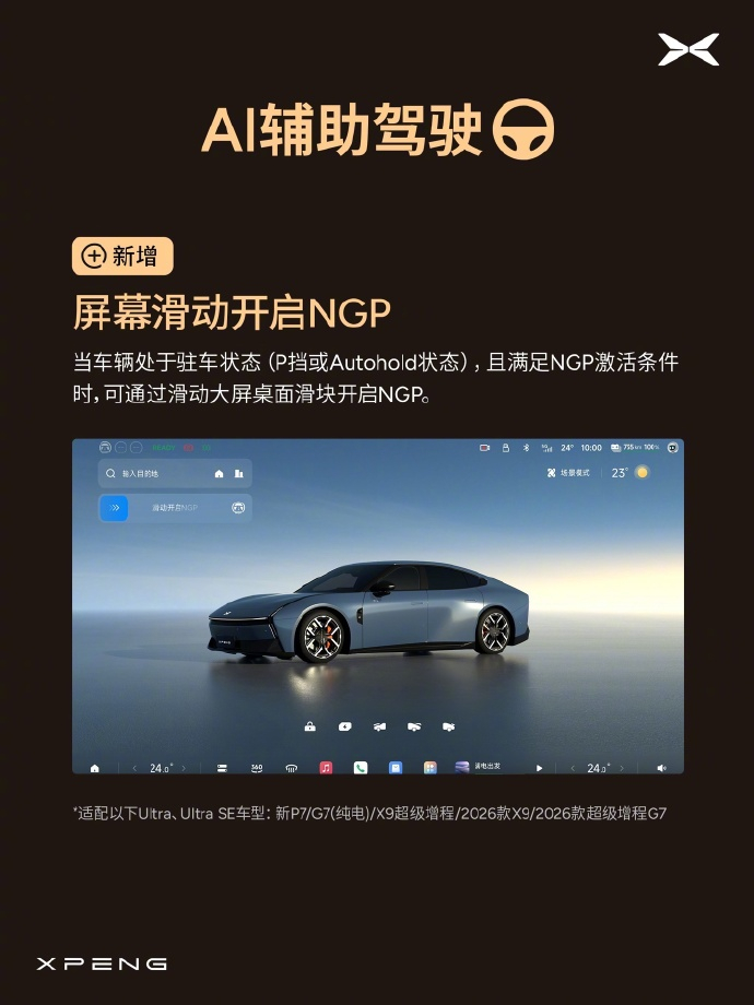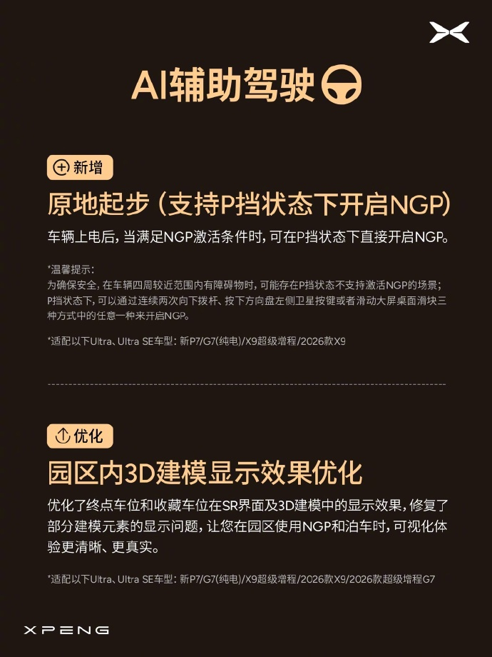 【小鹏天玑 AIOS 6.1.0 全量推送:第二代 VLA 2.0 上车,支持城市无导航 NGP 漫游】小鹏天玑 AIOS 6.1.0 正式全量推送,核心升级第二代 VLA 2.0,新增城市道路无导航 NGP 漫游功能,车辆可在无预设路线下自主行驶。同时优化了泊车可视化、悬架刚度等,智能驾驶体验再进一步。