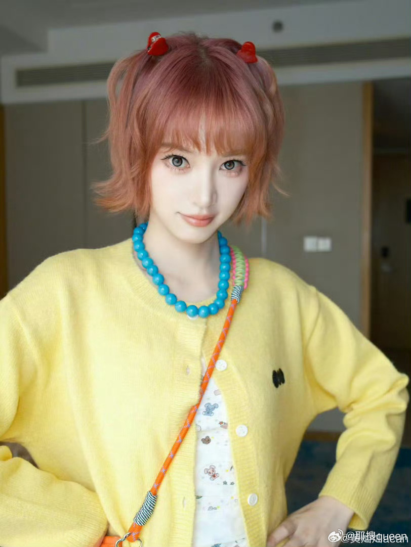 黄灿灿真人版阿尼亚黄灿灿也太可爱了吧!粉发造型软萌又灵动,可爱袖套搭配简约短袖,