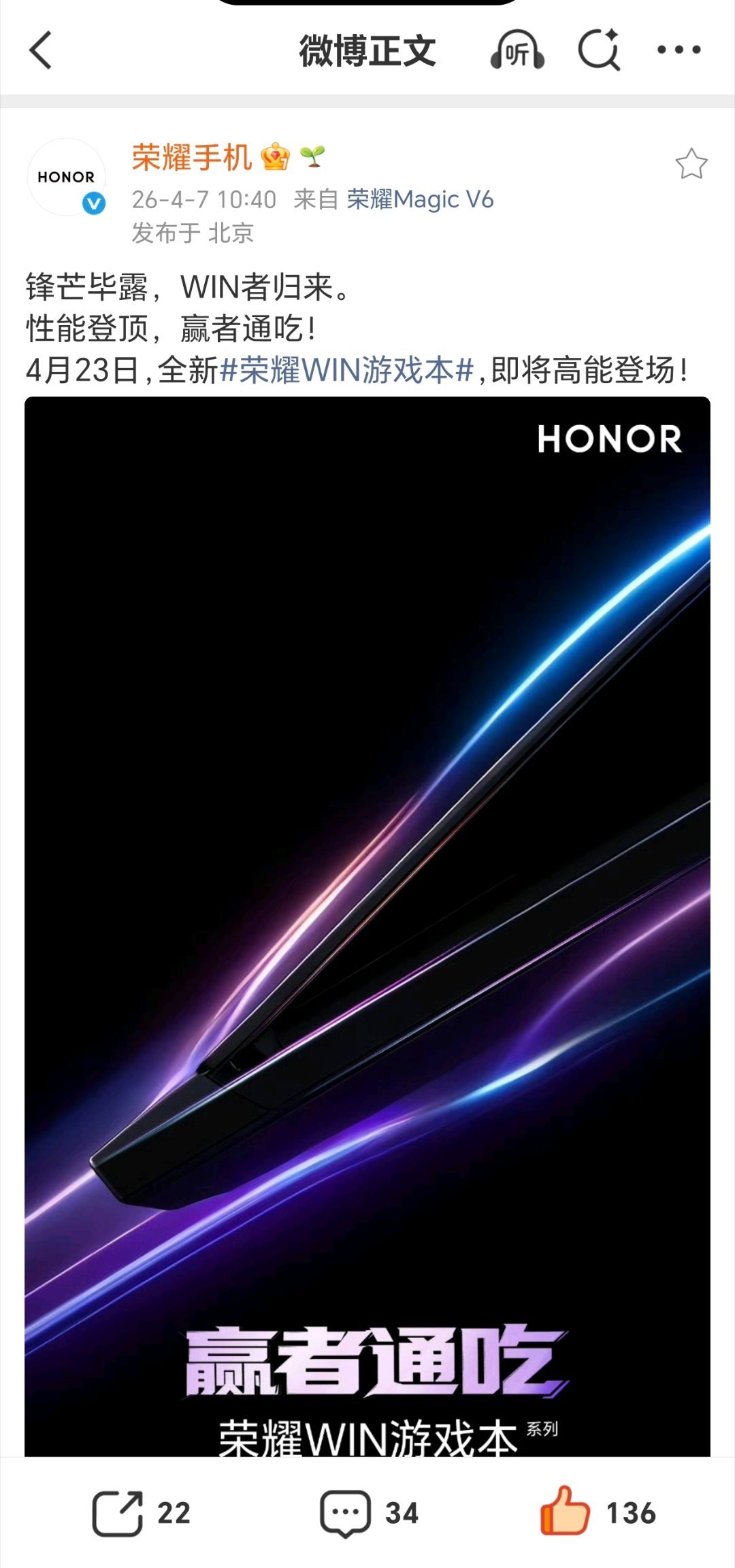 荣耀官方正式宣布旗下全新产品线WIN游戏本定档4月23日发布。