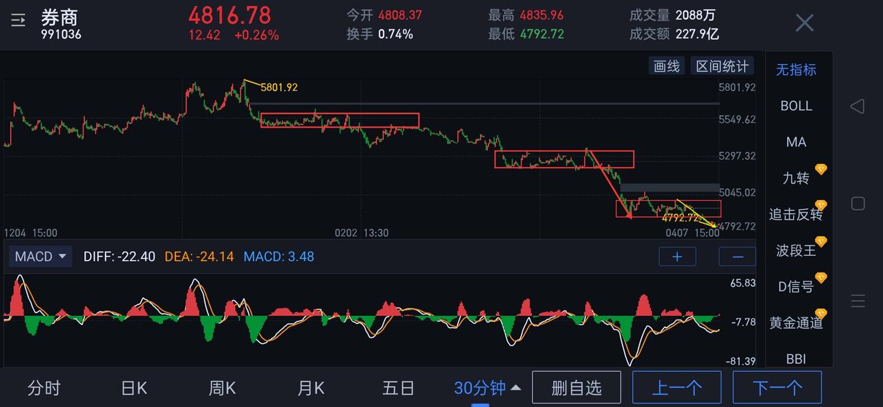 券商板块,明天将迎来关键窗口期。 券商板块,今天探底回升,日K以阳十字星收盘,显示目前多空处于短暂平衡状态。明天阶段性多空博弈将初分胜负。(明天观察能否形成日线底分型) 券商板块,明天能否有效站稳4792是关键。若能站稳,图(1) 五分钟中枢有望以背驰形态结束。后期可期待日线一笔上的生长。若不能站稳4792,接下来的回落离阶段性底部也为期不远,可以考虑分批布局。(图中黄色线段属于待完成走势)