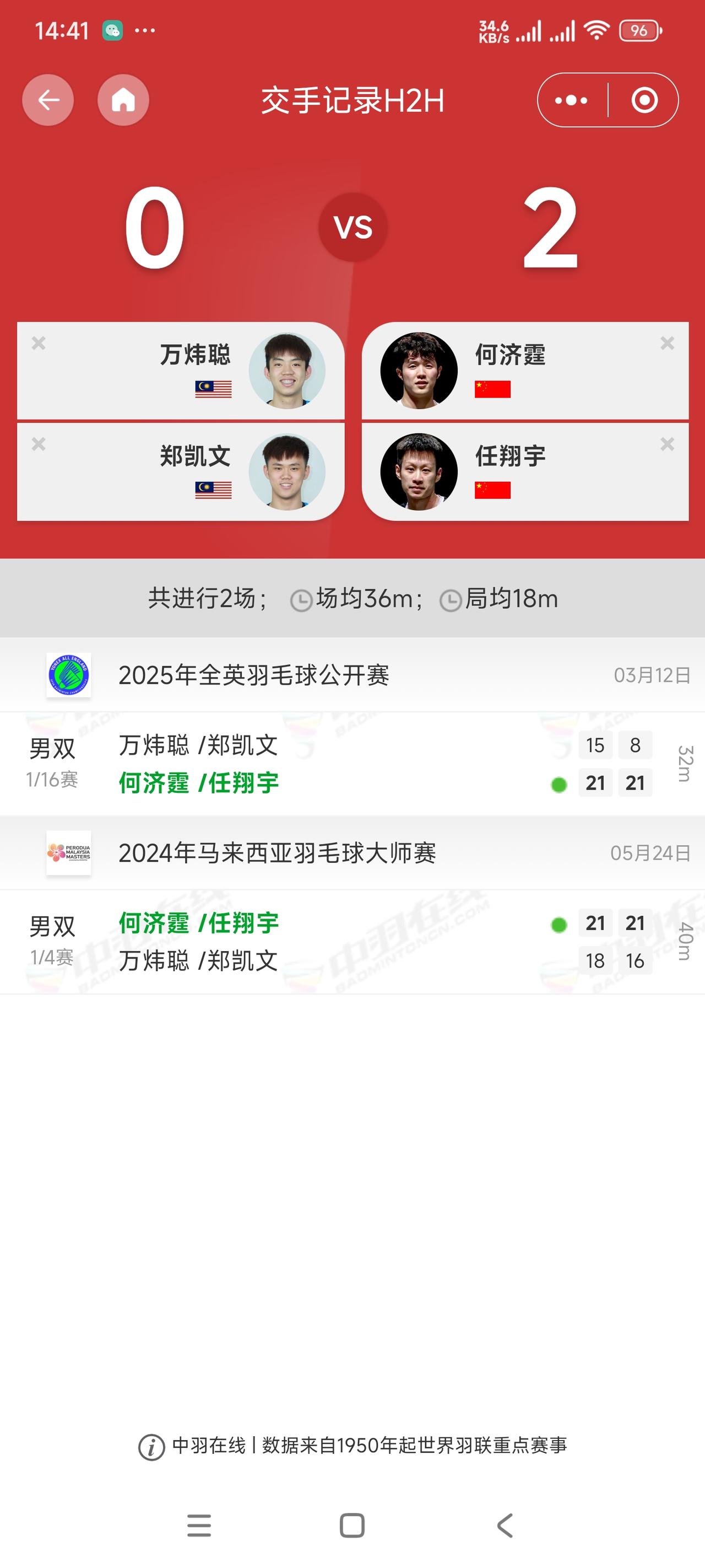何济霆/任翔宇亚洲羽毛球锦标赛小组赛战胜佐野大辅/相泽桃李,晋级亚锦赛正赛。何济霆/任翔宇 21-16、21-17 战胜佐野大辅/相泽桃李。由于佩拉查伊/帕克卡波替补正赛,任何赢下这场即可出线。国羽另一对小男双胡珂源林祥毅打过佐野大辅/相泽桃李,轻松地2-0获胜。正赛第一轮,何济霆/任翔宇迎战有交手优势的马来西亚组合万炜聪/郑凯文。