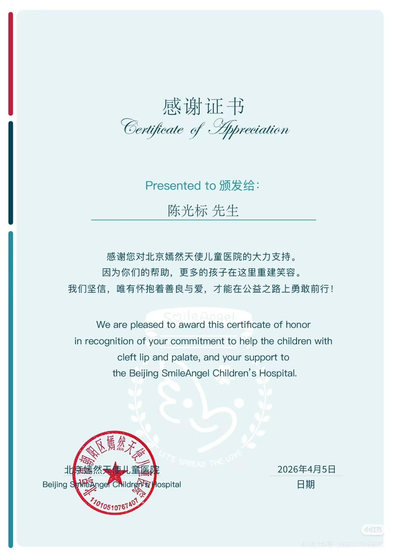 7日,嫣然医院向陈光标发布感谢证书,上面写道:“感谢您对北京嫣然天使儿童医院的大力支持。因为你们的帮助,更多的孩子在这里重建笑容。我们坚信,唯有怀抱着善良与爱,才能在公益之路上勇敢前行!”
