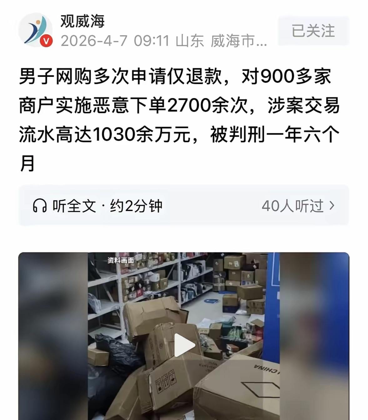 你见过“仅退款”想要白嫖商品的顾客吗?据最近的一则报道,一位叫陈某的男子将“仅退款”玩到了极致。 据悉,陈某是这样做的,他从商家买一件商品之后,都已经收到货了,他却提出“仅退款”。 商家一旦拒绝,陈某就开始恶意的骚扰商家,最后商家不胜其烦,便给陈某200元以上的和解费。 靠着和解费,陈某终于有了属于自己的收入。 江苏江阴法院通过审理得知,3年来陈某对900多家商户实施恶意下单2700余次,涉案交易流水超1030万元。 那么,陈某最后被判刑了吗? 事情还要从2023年8月27日说起,这天,网店老板曹先生遇到了一件糟心的事,一位叫陈某的男子明明已经收到货了,却要求“仅退款”。 可曹先生在检查了订单后发现他寄给陈某的商品完好无损,无任何质量问题。 更何况陈某“仅退款”,也没有给曹先生提交任何关于商品的照片。 曹先生也见惯了有一些顾客想通过“仅退款”白嫖的情况,便拒绝了陈某的要求。 然而接下来发生的事令曹先生感到崩溃。 陈某先是以曹先生的商品有质量问题为由,告知曹先生,他要去投诉曹先生的店铺。 后面又写了一句话,如果你不想这么折腾,就赔点钱算了。 从陈某的意思中可以看出,他想要200元以上的赔偿。 可曹先生毕竟做的是小本买卖,自然不愿意赔给陈某任何一分钱,这是没道理的事。 然而接下来,陈某把“仅退款”再次玩出了花样。 陈某直接通过网络查询到曹先生名下所有的网店,然后一次性下单几百件商品,总价值在好几万元。 曹先生在后台看到订单后立马开始打包,可曹先生刚开始打包,陈某立马提交“仅退款”。 这时,因为还没有发货,提交“仅退款”之后,陈某的钱回了自己腰包。 但这事却给曹先生造成了后果,因为这种情况下曹先生就不会再发货了,可如果他不发货,又违反了“未及时发货”的规定,就可能对店铺有一定的影响。 就在这时,陈某再次出现了,他再次和曹先生提出了和解,曹先生没办法,就只能给了陈某5000块钱作为赔偿。 3年来,陈某就是靠这种“仅退款”的方式,对900多家商户实施恶意下单2700余次。 网店老板对于陈某的此种做法,那可是苦不堪言。 因为和解也不是,不和解也不是,一旦和解了,万一给陈某惯了毛病,他下次再来怎么办? 一旦不和解,按照陈某的做派,万一给店铺带来更大的麻烦,又该如何是好? 所以网店老板也只能在心里默默的希望,像陈某这样的人,千万不要再给他们的店铺带来任何影响了。 然而陈某就是专门做这个的,只要他能尝到甜头,那他就不可能收手。 所以到最后,网店老板也实在看不下去了,便只好选择了报警。 面对民警时,陈某的态度倒是极好的。 通过调查得知,陈某是因为没有太高的收入,生活过得很拮据,便一直在想着如何多挣一些钱。 恰好有一次,陈某听闻有人就是这么干的,并且成功了,一向会模仿的陈某,就照着别人的做法,开始不断的从网店老板身上占便宜。 占不到便宜之后,陈某又想到了恶意骚扰对方,然后狮子大开口,问对方要一笔钱的办法。 陈某就这样坚持了3年,他虽然知道自己的做法不对,但一看到有甜头吃,他就收不住手。 可是,常在河边走,哪能不湿鞋,有一天陈某还是接到了民警打来的电话,确认了陈某的身份之后,没过多久,民警就来找陈某了。 如今,这个案子判得非常快。 因为陈某做的事都是留存了很多证据的,很容易就可以查出来,而陈某本人想到早晚有这么一天,也亲口承认了自己的犯罪事实。 民警一查,陈某交代的事情跟查到的证据是一致的。 说明陈某也意识到了自己的错,全盘托出。 到了判决环节,工作人员查到,陈某曾收到过和解费6400多元,判决陈某要将这笔钱退回。 同时判了陈某1年6个月有期徒刑。 不得不说,陈某这个人真的是太有小聪明了,一想到陈某在跟商家对接的时候,定会用各种言辞刺激商家,就觉得,陈某这个人一定是一个能说会道的人。 在商家看不到的地方,陈某正操作着网络,不断的用口才说服对方,企图让对方给他掏一笔钱。 想必双方在争辩的过程中,一定充满着很多戏剧性的地方。 但陈某不明白的一点是,这种不义之财,又怎么可能长久呢? 终有一天,陈某还是为自己的做法付出了应有的代价。 总结,网购平台的一些规则,原本是为顾客提供便利的,有些人却恰恰钻空子,想要讨甜处,但是要明白,这种侥幸心理千万不要有,因为你的身后还有法律。 脚踏实地,好好努力,用正常的方法实现成功,才是更为可取的做法。 对此,你怎么看? 参考资料,红星新闻,2026年4月7日报道。