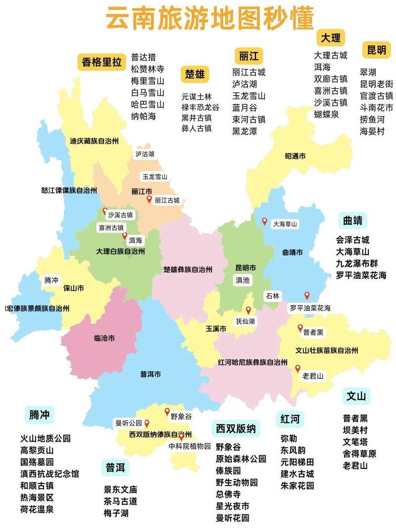 云南这16个州市的名称由来都十分有趣。 昆明,“昆”是少数民族部落之名,“明”有明亮之意,寓意着光明之地。 大理,“理”含治理之意,“大”表示尊崇,象征着大国之治。 曲靖,“曲”指弯曲的河流,“靖”有平定之意,代表着对这片土地安稳的期许。 玉溪,因其河水澄碧透亮,如潺潺玉带般流淌而得名。 丽江,金沙江古称“丽水”,“丽江”即美丽的金沙江。 普洱,在哈尼语里,“普”是寨,“洱”是水湾,意为水湾寨。 西双版纳,傣语意为“十二个千田”,是古时的行政划分。 迪庆,藏语意为“吉祥如意的地方”。 楚雄,由彝族首领“威楚”演变而来。红河,因境内有红河而得名。 文山,因“东文山”这一自然地貌得名。昭通,寓意“昭明通达”。 临沧,因濒临澜沧江得名。怒江,因怒江纵贯全境得名。 保山,原名永昌,为祈求永保安定而改名为保山。 德宏,傣语意为“怒江下游的地方”。每个名字背后都蕴含着深厚的历史文化。 云南 云南政区图 云南城市新名片