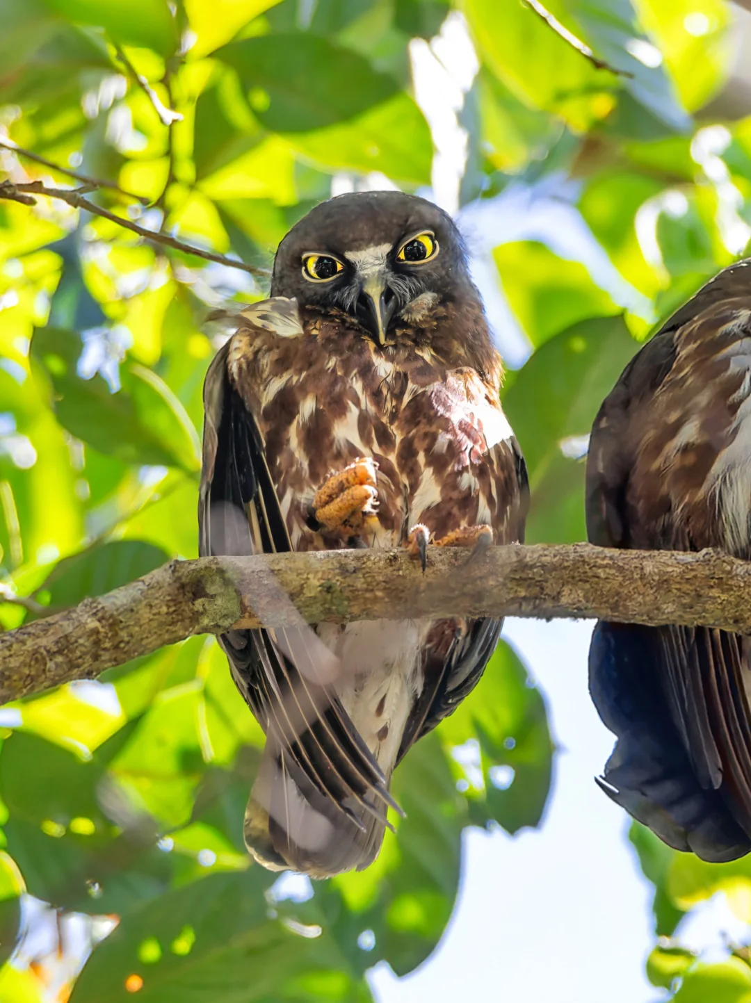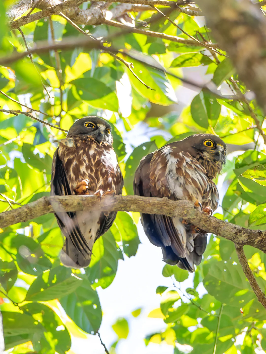 原创拍摄 巧克力色鹰鸮,也叫 茶色鹰鸮,Chocolate Boobook,鸮形目鸱鸮科鹰鸮属。菲律宾特有种吧。 巧克力色鹰鸮是典型的鹰鸮造型,上体深巧克力棕色,下体白色布满红棕色条纹,眼睛黄色。体型比其他几种分布重合的鹰鸮更大,翅膀也是单一巧克力棕色,胸部条纹更为分明。 进入雨林一下车,就告诉我们前面树上有“巧克力布布”,我们赶紧过去瞧瞧,远远的看到两只小可爱,不过这真的是太高了哈哈哈,仰拍太累了。没想到转个身没多久就被当地的长尾猕猴赶跑了。