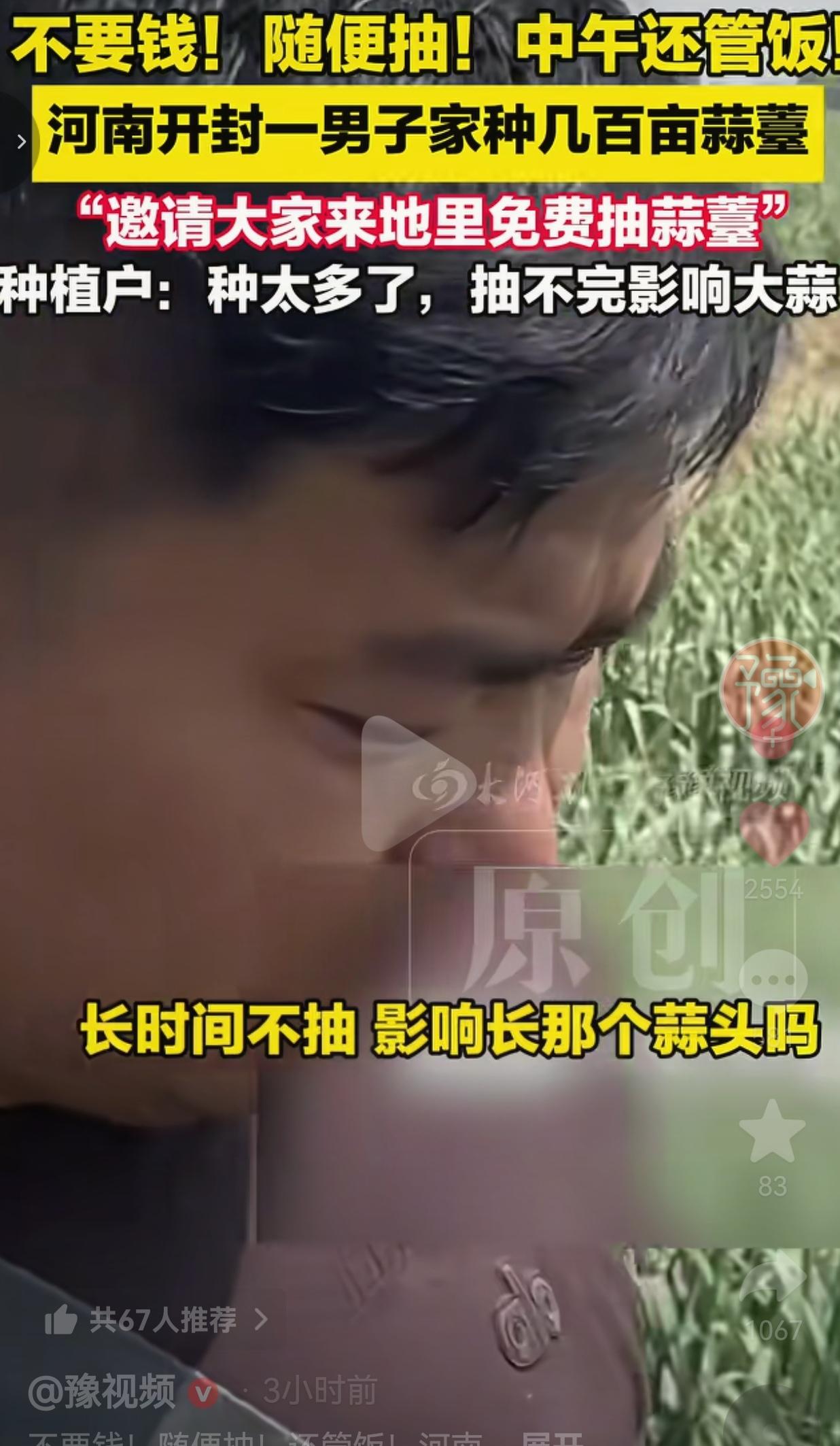 看哭!河南开封几百亩绿油油的蒜薹,一分钱不收随便抽,中午还管饱饭!不是套路不是营销,是真真切切的“送菜福利”,看完我只想立马收拾行李冲去地里! 事情得从几天前说起,开封一位大哥家里种了几百亩大蒜,眼瞅着蒜薹齐刷刷长得嫩得掐出水,可把他愁坏了。 庄稼人心里都知道,种蒜的人都清楚,蒜薹不及时抽,养分全往薹上跑,地下的蒜头就长不大,一年的辛苦全白费! 可几百亩地,光靠一家人抽,抽到猴年马月也抽不完。 雇人抽?一算账更崩溃,收购价才几毛钱一斤,雇人抽蒜薹的工钱都比卖蒜薹的钱贵,纯纯亏本买卖! 走投无路的大哥干脆豁出去了,直接在村里喊破嗓子:“都来地里抽蒜薹吧!抽多少拿多少,不要钱!中午管一顿热乎饭!” 谁能想到,这一喊直接炸了锅!消息一传十十传百,周边村民、城里市民全涌来了,地里乌泱泱全是人,有拖家带口来体验农事的,有开车后备箱塞得满满当当的,还有直播带着网友一起“云薅菜”的。 你看那地里的画面,绿油油的蒜薹随风晃,大家弯着腰手里飞快抽,不一会儿就攥满一把嫩蒜薹,蒜汁顺着手指缝流,新鲜劲儿隔着屏幕都能闻见。 大哥也不含糊,支起大锅烧火做饭,面条、炒菜管够,看着大家吃得香,他脸上的愁云全散了,嘴里还不停念叨:“抽完就行,蒜头能长好比啥都强!” 网友看到后评论说:我昨天刚去!抽了二十多斤,中午吃的鸡蛋面,巨香!这哪是干活,这是来享受田园生活的好吧! 也有的网友说:别说了,我已经在去开封的路上了!就想问问大哥管饭管够不?我能吃到他怀疑人生! 还有的网友说:这才是真正的助农啊!比那些花里胡哨的直播带货实在多了,白拿菜还吃了热乎饭,太暖心了! 更有网友表示:我老家也是种蒜的,每年蒜薹都愁卖,这大哥太聪明了,既解决了自己的难题,又给大家送了福利,绝! 说实话,看完这件事我心里特别不是滋味,又特别暖。 以前总觉得“免费的没好货”,可河南大哥的免费,是真真切切的无奈,也是实实在在的善意。 他不是傻,是懂种地人的苦,也懂普通人想要新鲜食材的心思;几百亩蒜薹看着是送出去了,可保住了几百亩大蒜的收成,这是农民的智慧,更是人与人之间最质朴的双向奔赴。 咱们总说城乡有隔阂,可这几百亩蒜薹、这一锅热乎饭,直接把隔阂全消了。 城市人来地里体验劳作,收获新鲜食材;农户解决燃眉之急,保住一年收成。 没有算计,没有套路,只有实打实的互帮互助,这才是最动人的人间烟火啊! 别再吐槽生活没乐趣了,河南开封的蒜薹地里藏着最鲜活的快乐;别再觉得农民只会埋头苦干,他们的善良和智慧,比任何鸡汤都动人。 最后。我想说的是:这世上最珍贵的“免费”,从来不是不劳而获,是你帮我解燃眉之急,我赠你满心欢喜。 对此,你怎么看?