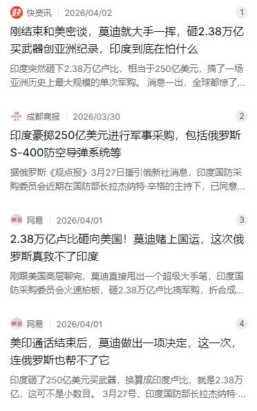 刚结束和美国的密谈,印度就猛地砸下了一个惊天巨雷!谁能想到,莫迪大手一挥,直接敲定了一笔2.38万亿卢比的"天价"军购大单。   麻烦看官老爷们右上角点击一下“关注”,既方便您进行讨论和分享,又能给您带来不一样的参与感,感谢您的支持!   3月24日,莫迪刚跟特朗普结束一场秘密通话,仅仅过了三天,印度国防部就甩出一张总额高达2.38万亿卢比的军购大单,折合成美元大概是250亿。这手笔,直接刷新了亚洲国家单次军购的规模纪录。   消息传出来的时候,说实话,很多人第一反应是不敢信。2.38万亿卢比是什么概念?这笔钱砸下去,相当于印度下个财年整个国防预算的差不多15%,甚至比教育、医疗这些民生领域的全年投入都要高。莫迪这哪是买装备,简直是在拿国运下注。   但仔细一查,这事儿还真不是空穴来风。3月27日,印度国防部长拉杰纳特·辛格主持的国防采购委员会正式批准了这份采购计划。按照印度国防部官方声明,这次采购涵盖海陆空三军多个方向,包括S-400远程防空导弹系统、中型军用运输机、攻击无人机、苏-30战机发动机升级,还有陆军的新型防空系统、坦克穿甲弹、“达努什”火炮,甚至还有海上用的重型气垫船,用来加固海岸防御。   那么问题来了,印度好端端的,干嘛突然这么着急地砸钱买装备?   说到底,还是心里不踏实。印度官方文件里老提什么“长期存在的、多领域的地区安全竞争”,翻译成大白话就是,跟周围几个邻居关系一直紧张,边境摩擦不断。特别是去年在边境跟巴基斯坦那场冲突,虽然印度军方吹嘘自家的S-400表现神勇,但实战也暴露出一个大问题——弹药库存根本跟不上消耗,仗还没打几天,仓库就快见底了。所以这次采购,补充弹药成了重头戏。   另外一个让莫迪坐不住的,是能源问题。印度是个极度依赖石油进口的国家,中东一乱,航运通道就悬了,油价一涨,国内经济就得跟着遭殃。前两年靠着大量进口打折的俄罗斯石油,确实赚了不少差价,但现在的局势不一样了,西方制裁越收越紧,俄罗斯能运出来的油越来越少,能源命脉捏在别人手里,莫迪心里能不发慌吗?   更让莫迪头疼的,是印度现在走钢丝走得太难了。   印度军队里超过七成的装备,都是苏联和俄罗斯留下来的老底子。离开了俄罗斯的零件和技术支持,很多武器就得趴窝。所以S-400还得继续买,这是稳住老关系的必要操作。但另一边,莫迪又拼命想往美国那边靠,去年两国签了个为期十年的防务合作协议,情报共享、联合军演、武器买卖全面升级,美国现在已经是印度第三大武器供应国了。   这次采购清单里的攻击无人机,就是典型的美国货。印度的算盘打得很精明,既不想得罪俄罗斯这个传统军火库,又想从美国手里拿到更先进的技术和战略支持,两头都不得罪,两头好处都想占。   但现实哪有那么理想?莫迪政府嘴上天天喊着“印度制造”和“自力更生的印度”,国防工业的产值也确实在涨,可一到真正的高端装备,比如战斗机发动机、导弹制导系统这些核心玩意儿,还是得老老实实找国外买。   就拿这次采购来说,一边是给本土的“光辉”战机下了97架的订单,算是扶持国产产业,另一边又是天价的外国装备。这种两条腿走路的方式,看起来平衡,实际上恰恰暴露了印度核心技术短板一直没补上的尴尬。自家的“阿琼”坦克折腾了几十年,到现在都没法真正挑大梁,“光辉”战机也是问题不断,真正打仗的时候,还得靠别人家的货。   那么问题来了,这么大一笔钱,从哪儿来?   2026年印度的经济形势本来就不算太乐观。虽然官方数据显示经济还在增长,但增速已经被多家机构下调,资本市场波动明显,外资动不动就大规模撤出,制造业占比始终上不去。在这种财政压力下,硬生生挤出2.38万亿卢比来买装备,结果只有一个——要么增税,要么压缩别的开支。   压缩什么呢?最容易被砍的就是民生。教育、医疗、基建这些领域的钱,在军购面前都得往后靠。印度的贫富差距本来就已经大得离谱,底层老百姓看病难、上学难的问题长期得不到解决,现在军费再这么猛涨,民生的钱就更紧张了。军备搞上去了,老百姓的日子却更难了,这种矛盾早晚要爆发。   而且,花钱买装备只是一锤子买卖,真正烧钱的是后续的维护和使用。引进那么多不同国家的装备,技术标准五花八门,零件不通用,维修体系各搞一套,光是后勤保障就是一个巨大的无底洞。   更麻烦的是,印度这么一搞,等于把自己彻底绑上了美国的战车。美国这几年拉拢印度,说白了就是想在印太地区找一个能帮自己盯住中国的棋子。军火生意只是表面,更深层的目的是把印度的防务方向和战略选择牢牢拴在自己手里。