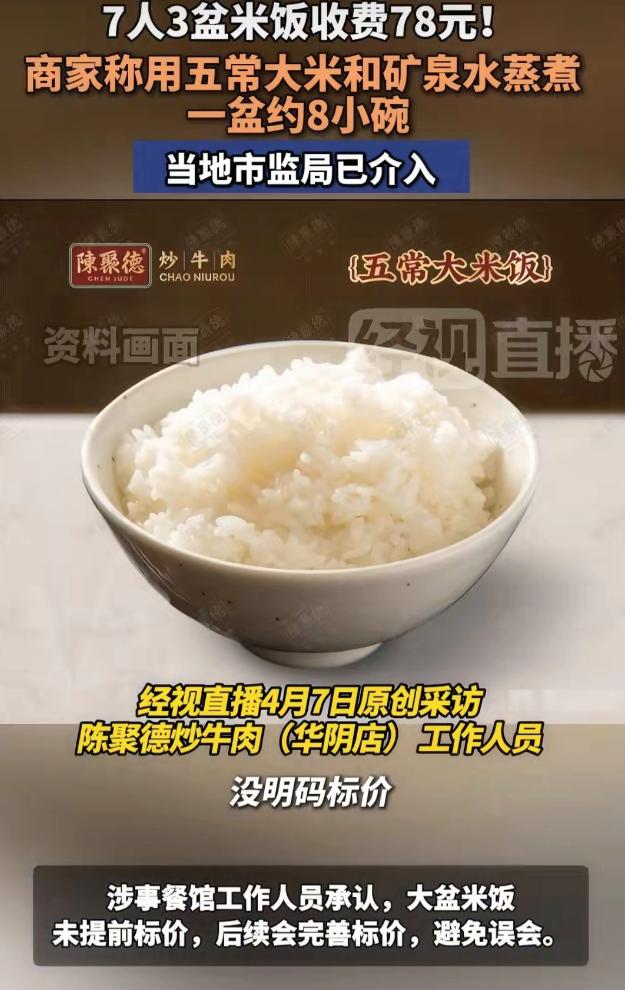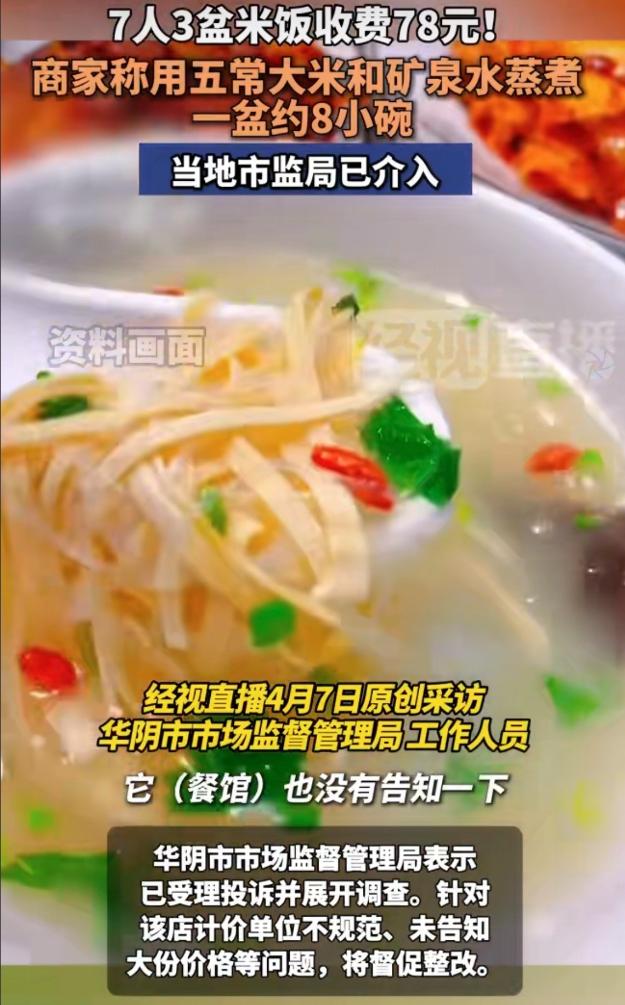 贵了还是便宜了!陕西华阴,7人去爬华山,下来后就找了家饭店吃饭,一共消费了439元,可在结账时发现,3盆米饭被收了78元,店家解释:是五常大米和矿泉水蒸煮。但几人认为,没有标价就不对 当时,几人刚从山上下来,饿得前胸贴后背,直接冲进一家饭店。七个人,点了十个菜,不少还是肉菜,吃到嘴里那叫一个舒坦 结账的时候一看账单,439块钱。说实话,按现在的物价,七个人吃这么多菜,这个数真不算贵,甚至还有点划算 可仔细一看明细,有人不乐意了。三盆米饭,收了78块钱。一盆26块 游客觉得这米饭收贵了。店家也有自己的说法:我们这不是普通米饭,用的是五常大米,而且是用矿泉水蒸出来的。一盆能盛8小碗,平均下来一碗三块两毛五。菜单上小份米饭是3块钱一份,这么一算,大盆还便宜了一点点 问题出在哪儿呢?大盆米饭没标价 菜单上只写了小份3元,游客要加大盆的时候,店家没说多少钱。游客心里想的是,米饭能贵到哪去?结果结账一看,78块。这种心理落差,换了谁都会不舒服。不是说吃不起这几十块钱,而是觉得被蒙了一下 店家也承认了,大盆确实没提前标价,说后续会完善。市场监管部门已经介入,指出计价单位不规范、未提前告知价格等问题,要求整改 对此,有人说,七个人吃十个菜才439,米饭78虽然不便宜,但整体算下来人均七十多块,爬完山吃顿好的,真不算贵 也有人反问:菜价便宜是菜的事,米饭没标价是另一码事,不能混在一起说 客观来说,这事的本质不是什么贵不贵,而是透不透明。现在的消费者不是花不起钱,是不想花糊涂钱。你提前说了,他乐意买单;你不说,等他自己发现,哪怕只多花一块钱,他也觉得不舒服 米饭是五常大米还是普通大米,是用矿泉水还是自来水,这些对消费者来说,重要吗?重要,但前提是你得让他知道。他不知道的时候,他只会按最普通的米饭来估价。等他知道了,可能觉得值,也可能觉得不值,但至少这个判断是他自己做的,不是被动的 这家店整体菜价确实实惠,七个人十个硬菜才四百出头,在景区周边算良心了。就因为这78块的米饭没标清楚,惹出一场投诉,反而让实惠的菜价也被带偏了节奏,挺可惜的 7人3盆米饭收费78元 当地市监局介入