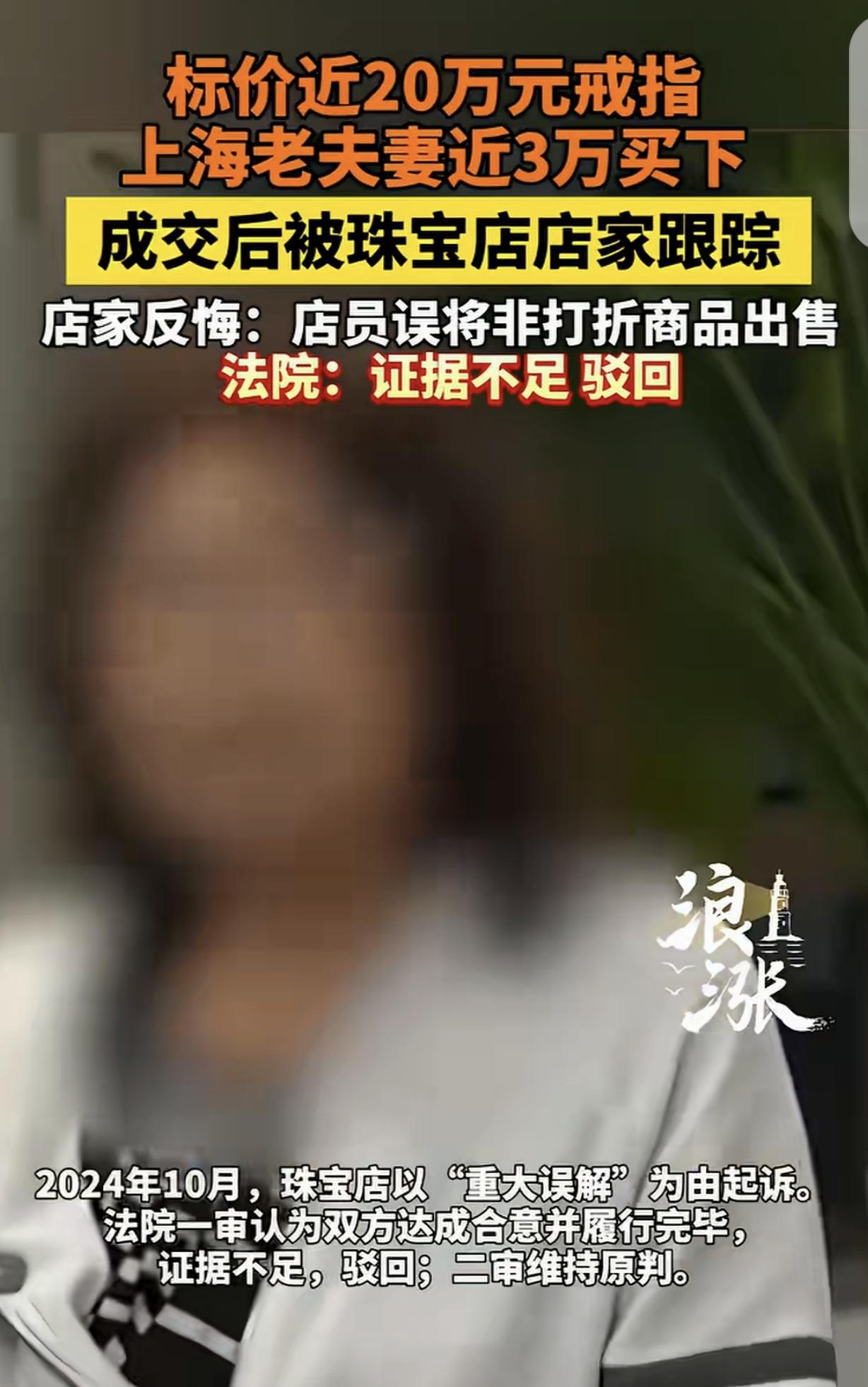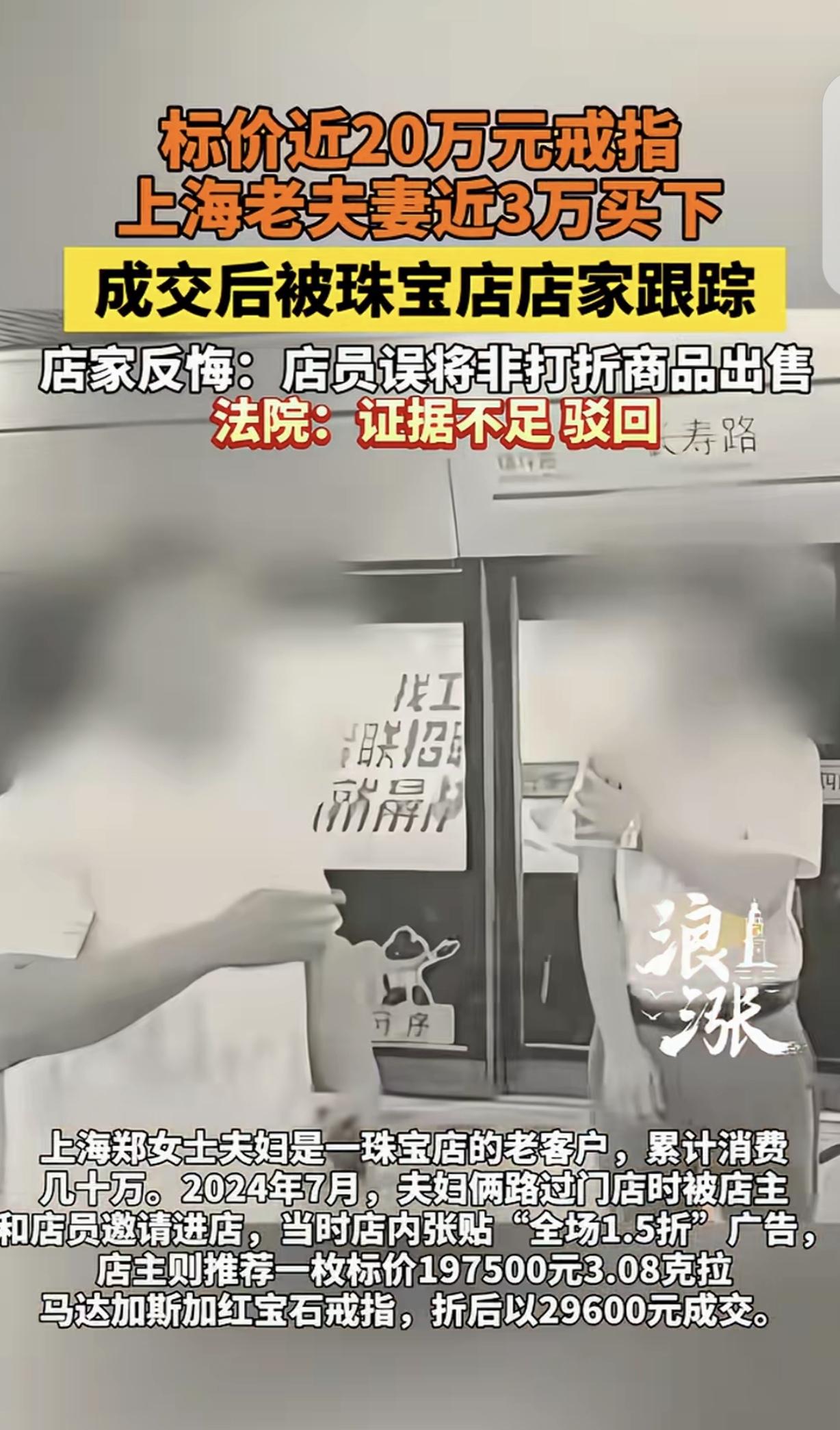 “玩不起!”上海,一70多岁阿婆,在珠宝店只花29608元,就买了3.08克拉,标价197500元的红宝石戒指,阿婆乐坏了,可戒指还没捂热乎,2小时后,珠宝店老板突然反悔,说红宝石戒指有质量问题,让她退回去。事出无悔,阿婆不答应,2天后,她和老伴坐地铁,被珠宝店老板跟踪纠缠,吓得阿婆赶紧报了警,可警方说管不了,让阿婆去法院。老板直接把阿婆告上法庭,案子经过2审,法院判了。 郑阿婆70多岁,是个精致的上海老太太,从年轻美到老。 人家家里不差钱,也没爱美的资本,平时就爱光顾珠宝店,遇到喜欢的,挥金如土,直接就买下来,连眼睛都不眨。 珠宝店老板做生意多年,阅人无数,一看郑阿婆这么有实力,把她当成摇钱树,跟她处的非常熟络,郑阿婆自然而然的,成为店里的老主顾。 这天,珠宝店老板又给郑阿婆打来电话,邀请他们老两口来店里,说有一款红宝石戒指,打折促销。 郑阿婆一听来了精气神,二话不说来到珠宝店,立马被橱窗里的红宝石戒指吸引。 她凑近一看,标价197500元,而老板说,这款红宝石戒指打折,29600元就能成交。 郑阿婆一听心花怒放,区区29600元,对她来说九牛一毛,物有所值,一个要卖,一个中意,双方干脆利落的成交了。 可让郑阿婆万万没想到的是,只过了2小时,她正在家里把玩红宝石戒指时,竟然接到了珠宝店老板的电话。 对方一口咬定,这款红宝石戒指有质量问题,让郑阿婆把戒指退回去,他不卖了。 会说的不如会听的,郑阿婆一把年纪了,好话赖话听不出来吗?她听话听音,知道老板卖便宜了,后悔了,竟然借口说戒指有质量问题。 郑阿婆也没戳破,直接说,有质量问题她也不退货,落棋无悔,一手交钱一手交货了,就这么着了。 珠宝店老板干脆开门见山的告诉郑阿婆,这个红宝石戒指,是寄售物品,按照规定,不应该打折出售。 真是胡说八道,忽悠谁呢?既然是寄售,难道珠宝店老板一开始不知道吗?明明是后悔了,又找借口,真是玩不起,你情我愿的买卖,最后觉得卖便宜了反悔,凭啥? 可珠宝店老板不依不饶,郑阿婆坐地铁直接被他跟踪纠缠,这是要抢咋地? 郑阿婆怕了,她一把年纪了,对方如果来硬的,她还真不是对手,直接报了警。 可警方说,他们属于经济纠纷,应该上法院。 珠宝店老板一纸诉状把郑阿婆夫妻告上法庭。 这事儿说白了,就是珠宝店老板玩不起。郑阿婆花钱买戒指,双方自愿成交,哪有事后反悔的道理? 老板先是借口质量问题,后又说寄售物品不该打折,这明显就是卖便宜了后悔,想找借口把戒指要回去。 做生意讲究诚信,这么耍赖,以后谁还敢来店里消费?郑阿婆坚持不退货,是维护自己的合法权益,法院的判决也公平公正,给这种不诚信的行为敲响了警钟。 《民法典》第577条规定,当事人一方不履行合同义务或者履行合同义务不符合约定的,应当承担继续履行、采取补救措施或者赔偿损失等违约责任。 具体到本案,珠宝店老板与郑阿婆已达成买卖合同,老板应按约定交付戒指,事后反悔要求退货,构成违约,应承担违约责任,法院判决其败诉符合法律规定。 一审判决珠宝店老板败诉,他不服,提起上诉二审维持原判。 对此,你怎么看?