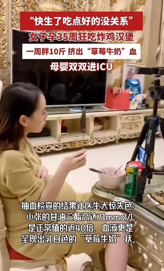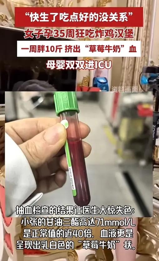 “悲剧还是发生了!”浙江,一女子怀孕时,患了妊娠期糖尿病,所以严格控制饮食,到了孕35周,她心想反正快要生了,稍微吃点好的没关系,于是她开始大吃大喝,毫无顾忌,结果一周后,女子腹痛难忍,抽血时血液都是乳白色,最后母子双双进ICU! 小张是一位28岁的准妈妈,怀孕中期时被确诊了妊娠期糖尿病。为了肚子里的宝宝,她一直很自律,米饭按克数吃,甜食基本不碰,血糖控制得还算平稳。可到了孕35周,眼看胜利在望,她心里那根紧绷的弦松了。想着“就快卸货了,犒劳一下自己总可以吧”,她彻底放开了。 炸鸡、汉堡、奶茶、蛋糕……之前不敢碰的高油高糖食物,这一周里她吃了个痛快。短短七天,体重猛增了十斤。身体很快发出了警报。先是肚子隐隐作痛,她没太在意,以为是普通的肠胃不适。直到疼痛加剧到无法忍受,家人才慌忙把她送进医院。 抽血检查时,抽出来的血不是正常的鲜红色,而是浑浊的乳白色,化验结果她的甘油三酯高达71mmol/L,是正常值上限的四十多倍! 这是典型的高脂血症性急性胰腺炎,一种非常凶险的妊娠期并发症。 情况万分危急,小张被火速转往杭州一家大型三甲医院。医生检查后发现,连胎盘表面都覆盖了一层厚厚的白色油脂。 高浓度的血脂堵塞了胰腺的血管,引发严重的炎症,并随时可能导致多器官衰竭。为了保住大人,医生当机立断:“必须立即终止妊娠!” 一场紧急剖宫产手术随即展开,宝宝虽然平安出生,但因为不足月,肺部等器官发育不完全,一出生就被送进了新生儿重症监护室(NICU)。而刚刚生产完的小张,自身病情危重,也被送进了成人ICU,接受血浆置换治疗,需要把体内充满脂肪的“牛奶血”抽出来,用健康的血浆替换进去,以快速清除血液中的致命脂肪。 一场为期一周的“美食狂欢”,代价是母子双双在鬼门关前走了一遭。很多人可能不理解,不就是多吃了几口,怎么会这么严重?这是因为怀孕本身就会让孕妇的身体处于一种特殊的代谢状态,胰岛素抵抗增加,血脂水平本就比平时高。 对于患有妊娠期糖尿病的孕妇来说,这种代谢紊乱更加明显。此时如果突然摄入大量脂肪和糖分,血脂就会像决堤的洪水一样飙升,远远超出身体的处理能力,从而诱发急性胰腺炎。 妊娠期糖尿病的管理是一场贯穿整个孕期的“持久战”,越到孕晚期越不能松懈。因为胎儿在最后几周体重增长最快,对妈妈血糖和代谢的影响也最大。 任何的侥幸心理和短暂放纵,都可能让之前数月的严格努力前功尽弃,并将母婴置于巨大的风险之中。 饮食控制不是惩罚,请一定相信科学,遵从医嘱,坚持到最后一刻。你的每一分克制,都是在为宝宝铺就一条更安全的出生之路。 各位读者你们怎么看?欢迎在评论区讨论。