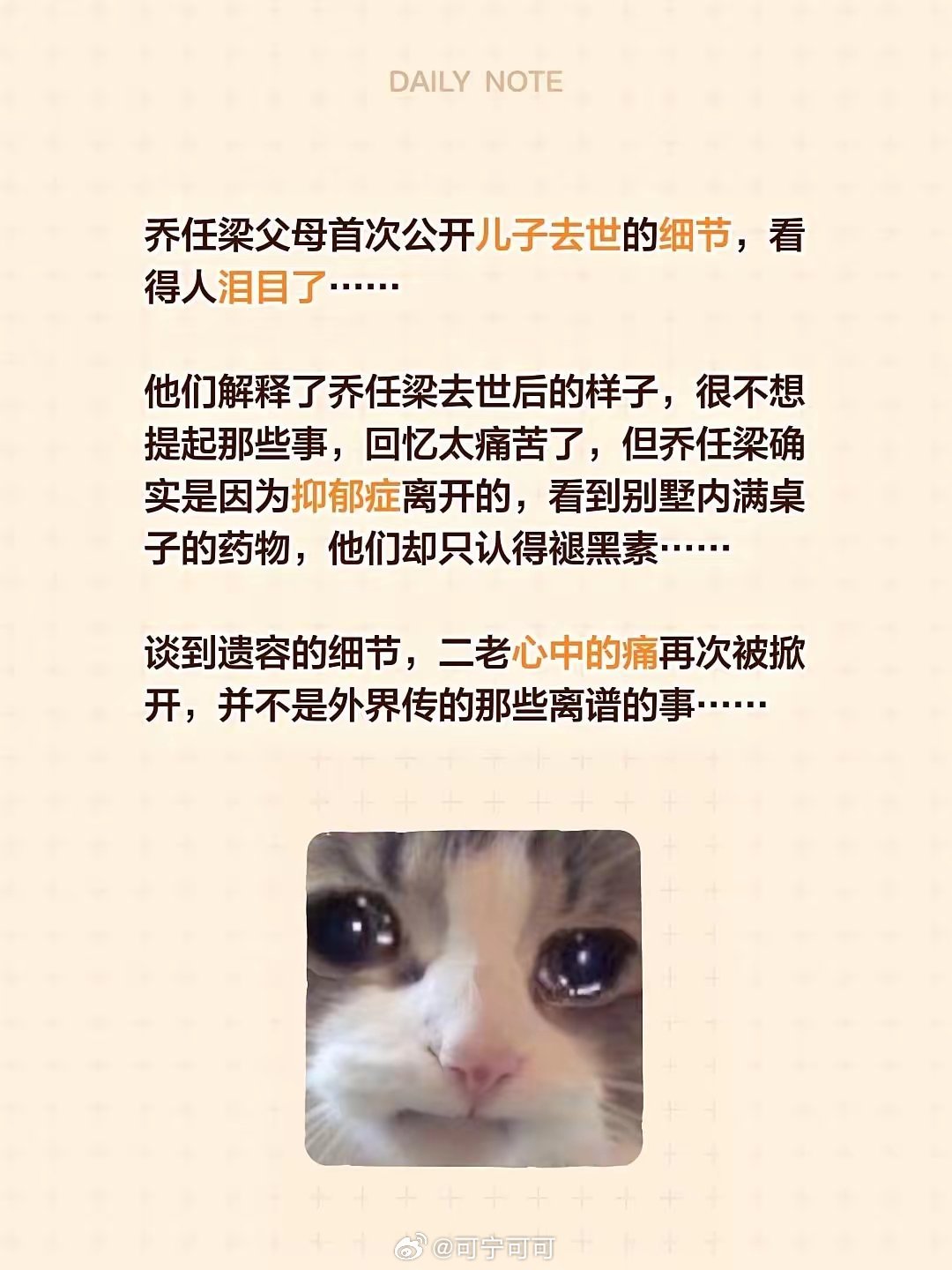 泪目!乔任梁父母首揭离世细节,十年谣言终于真相大白十年了,乔任梁父母终于鼓起勇气,首次公开儿子离世的真相,每一句话都戳中泪点……他们反复强调:乔任梁确因重度抑郁症离开,绝非外界恶意揣测的“意外”,那些“被害”“分尸”的离谱谣言,是对逝者最大的亵渎!别墅里满桌的药物,二老当时只认得一瓶褪黑素;失眠二十天、喊着“累了”的儿子,去世前一晚肩背异常僵硬,他们却没读懂这是抑郁症的求救信号。谈到遗容上被恶意解读的“异常”,二老红着眼解释:只是遗体自然变化与衣物痕迹,哪有什么阴谋?十年间,二老承受着丧子之痛与网络谣言的双重折磨,每一次回忆都像在剜心。他们只想让儿子清清白白,让谣言彻底消散。愿逝者安息,愿恶意造谣者止步。尊重逝者,守护善良,别让伤痛再被消费!🙏