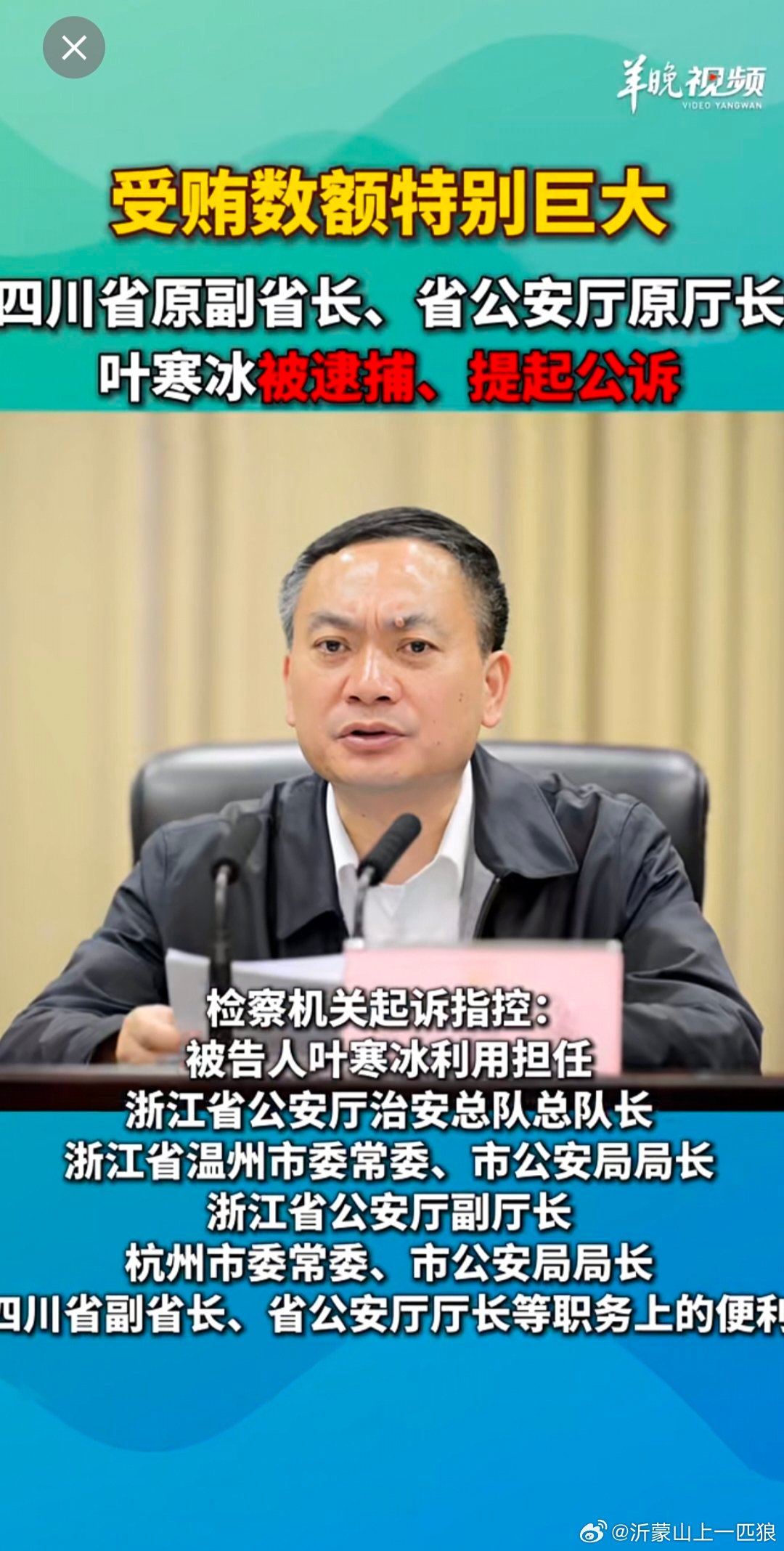 【受贿数额特别巨大】四川省原副省长、省公安厅原厅长叶寒冰被逮捕、提起公诉(来源