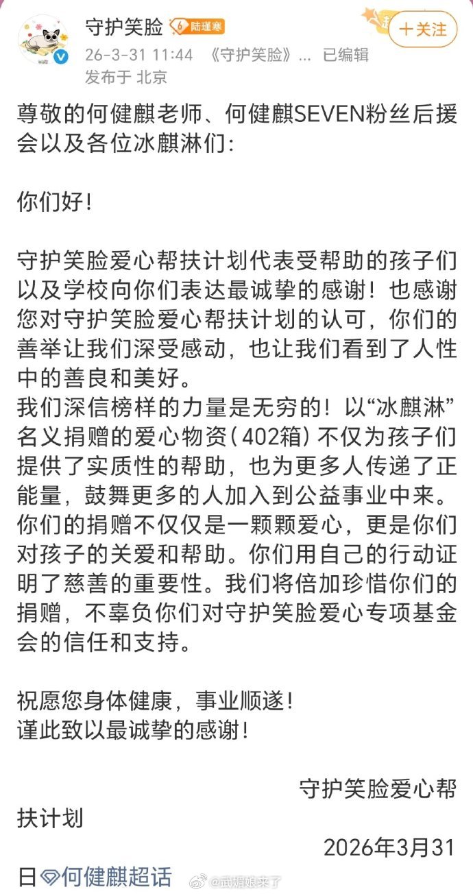 何健麒粉丝又做公益了,向困难地区捐赠402箱物资及900余册书籍,用行动诠释温暖与担当。正能量满满,为这样的爱心点赞!👍