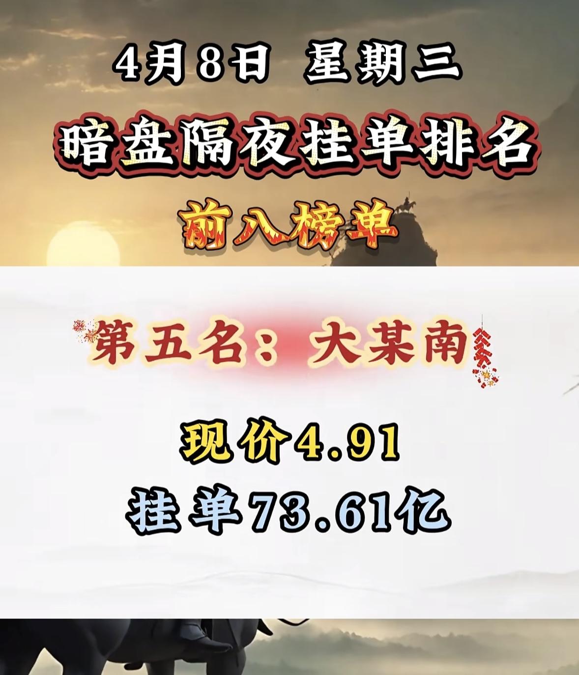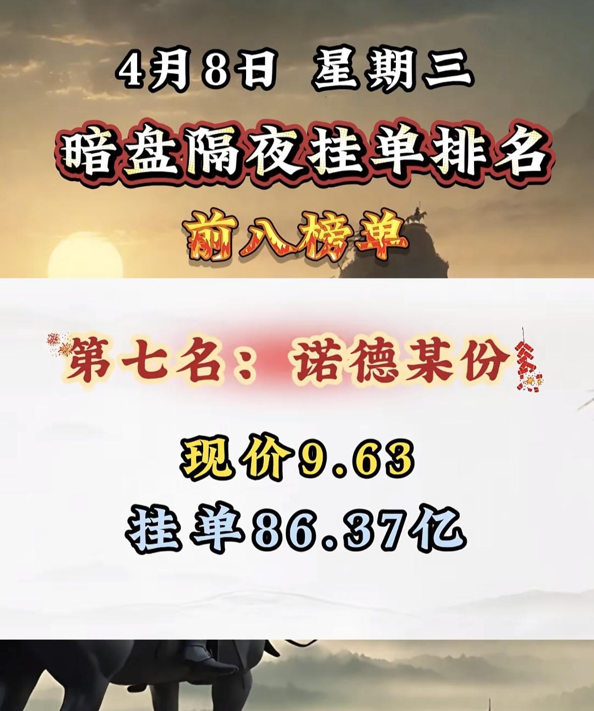 4月8日暗盘隔夜挂单排行榜揭晓 4月8日诺德股份暗盘隔夜挂单排名很是惊人,现价9.63元,挂单竟达86.37亿!这数字着实让人惊掉下巴。此前4月2日,诺德股份股价跌了5.4%,报8.59元/股。华商基金旗下2只基金重仓它,合计持有572.14万股,当日浮亏280.35万元。再看看4月7日A股情况,缩量反弹埋隐患,全市场成交额缩量超450亿,主力呈现诱多手法。诺德股份这次巨额挂单,背后是机会还是陷阱?实在让人期待后续走势。