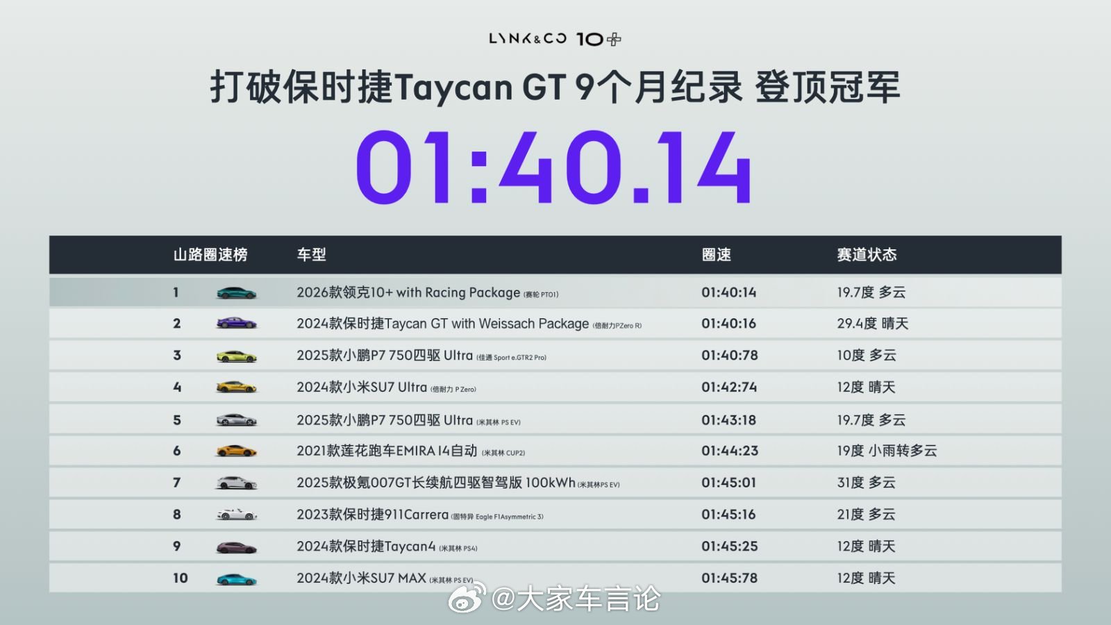 而作为领克纯电家族的重磅新作,领克10+ 顺利登顶山路圈速榜,以1分40秒14,成功超越Taycan GT。