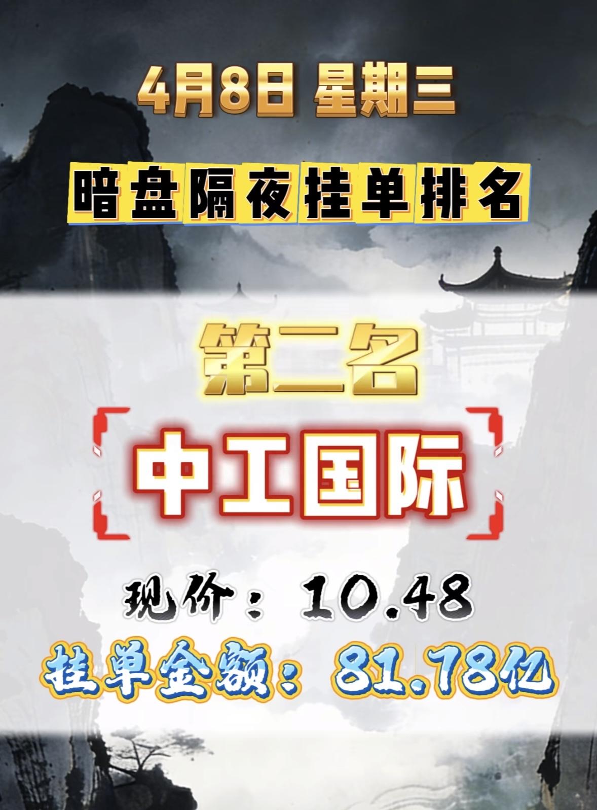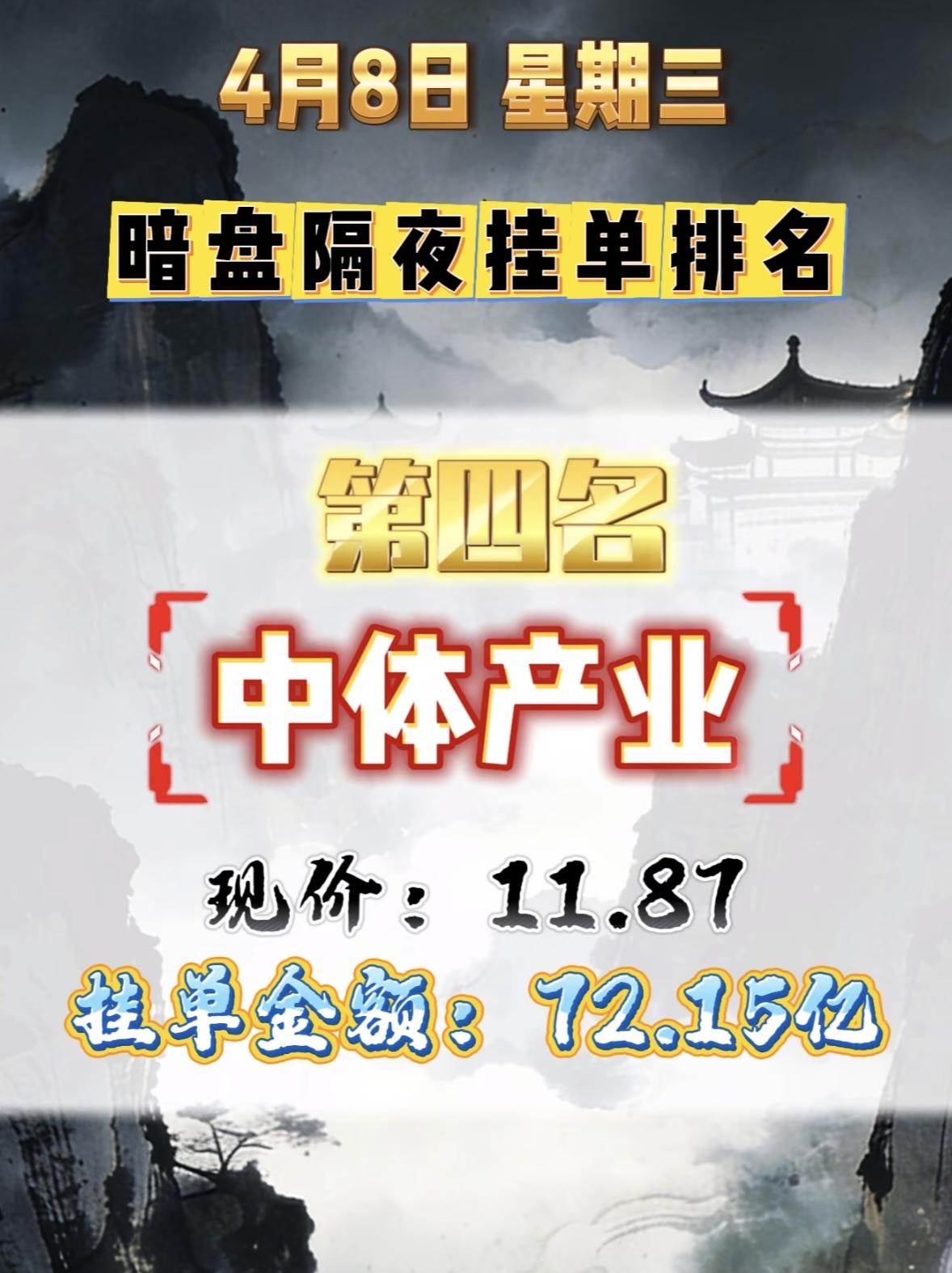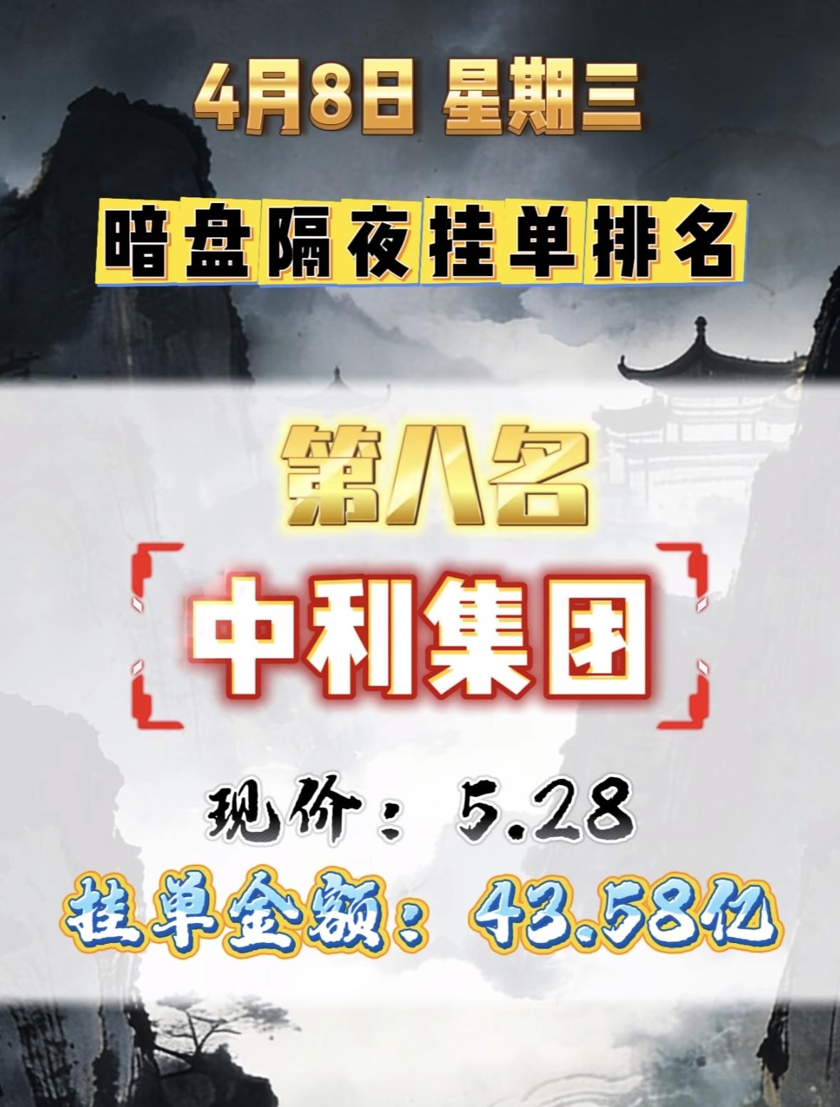 4月8日周三暗盘隔夜挂单排行榜出炉 中利集团暗盘隔夜挂单排行第八,现价5.28