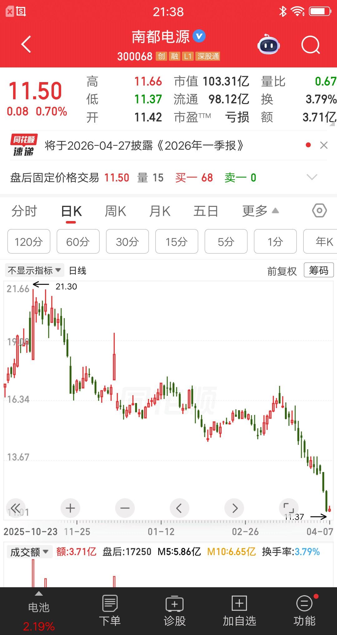 一位四川的股民,看到董事长要大额减持,肺都快气炸了。他是在去年11月,20.62元买入500股南都电源,买完之后股价就跌跌不休。今年2月份他为了降本,15.71元再次加仓500股,没想到又是一波快速下跌。他的账户亏了33%,亏损金额约7000元。