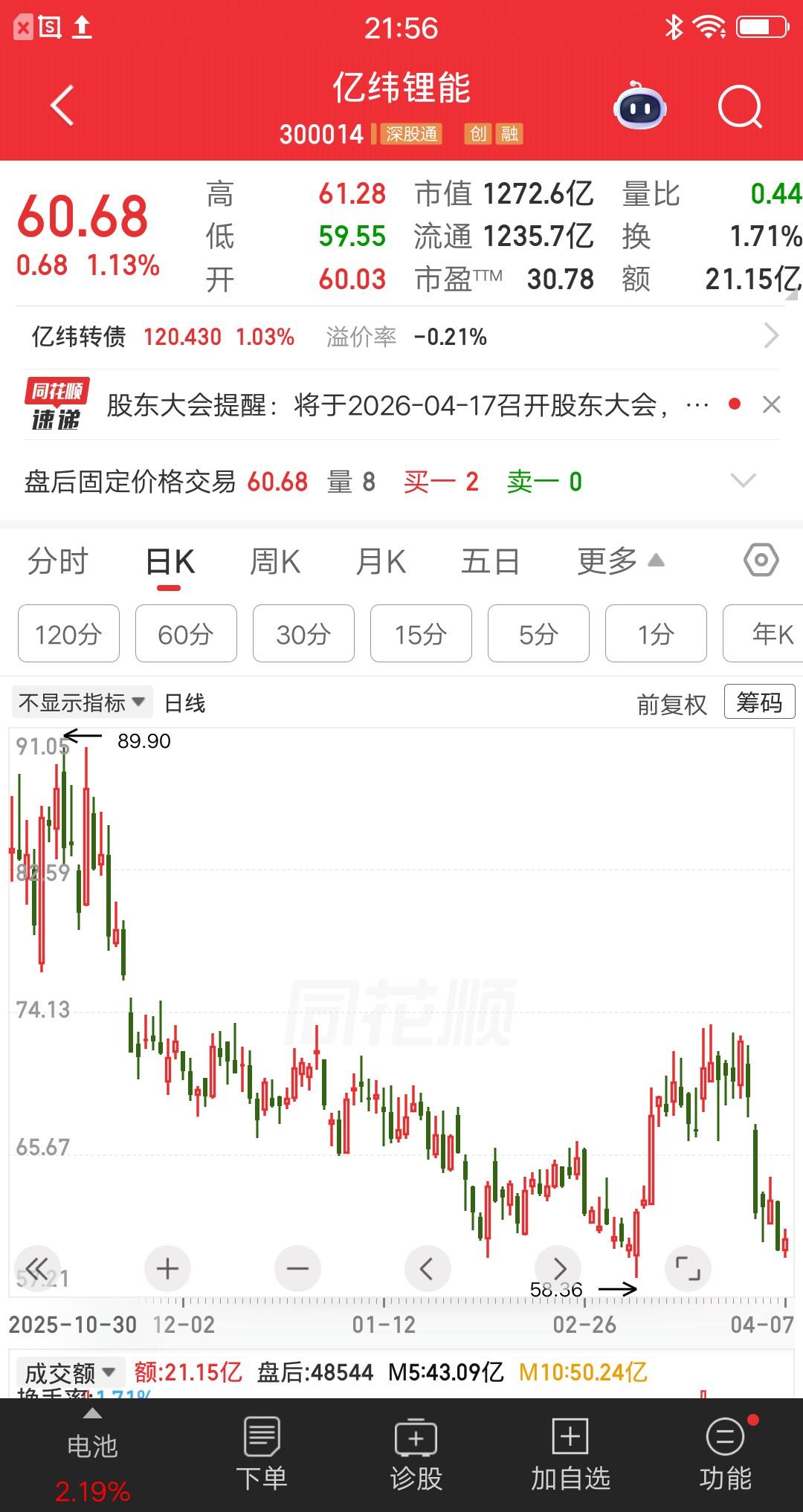 一位四川的股民,看到亿纬锂能的一季报,兴奋得手舞足蹈,心想这下回本有望了。他在去年10月份,83.8元买入200股亿纬锂能。买完以后股价小幅上涨,他看着账户浮盈很开心,可这一点利润压根不够看。之后股价明显下跌,他赶紧在71.47元加仓200股,成本降了不少心情缓和多了。