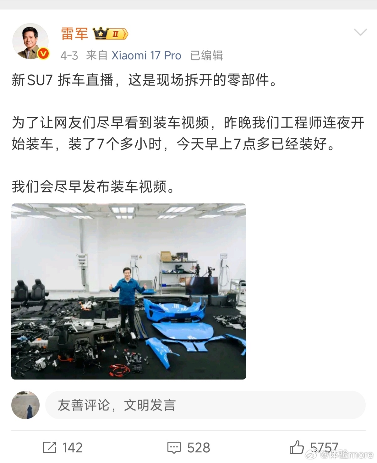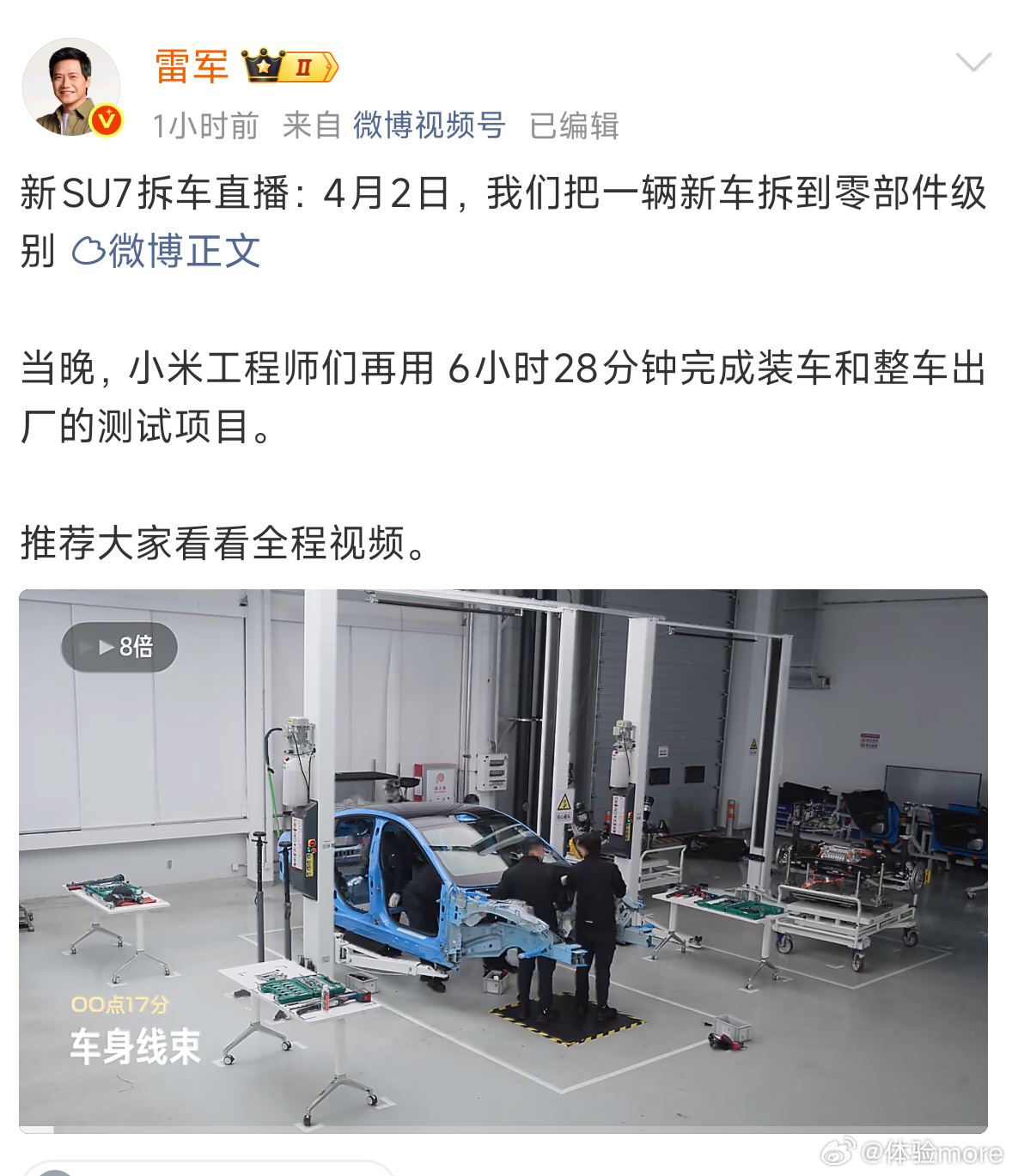 之前雷总4月2号拆车直播的时候,网友就想看装车视频,于是小米工程师们连夜装车,只用了6小时28分钟就完成了装车和测试,效率挺高的,毕竟装车可比拆车难多了,然后今天就把视频发出来了。
