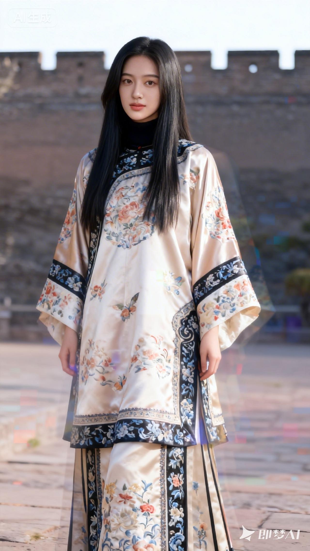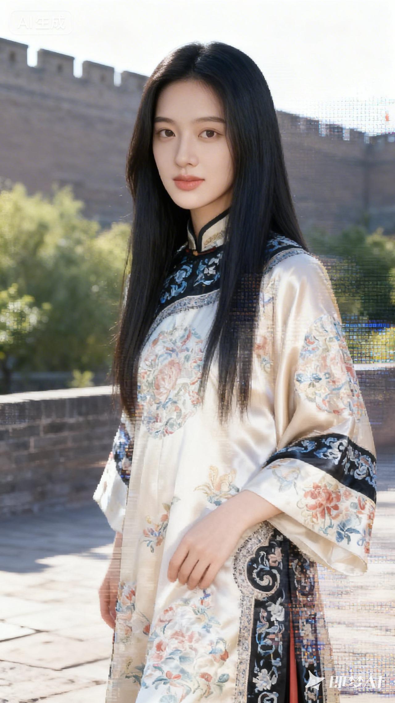 古风少女在城墙下,黑发飘飘,衣袂翩翩