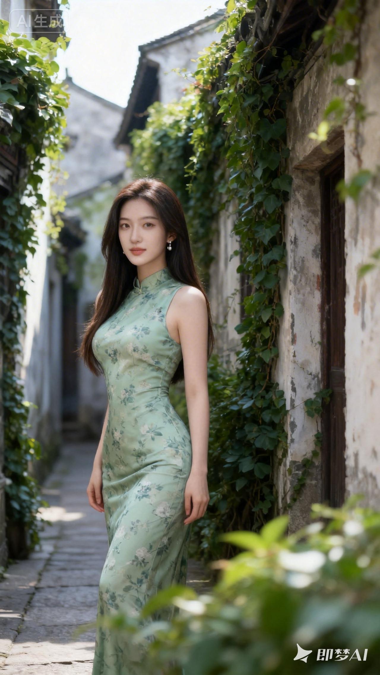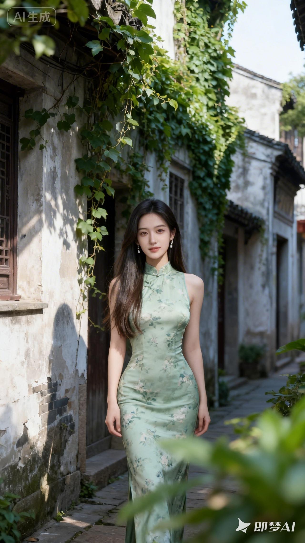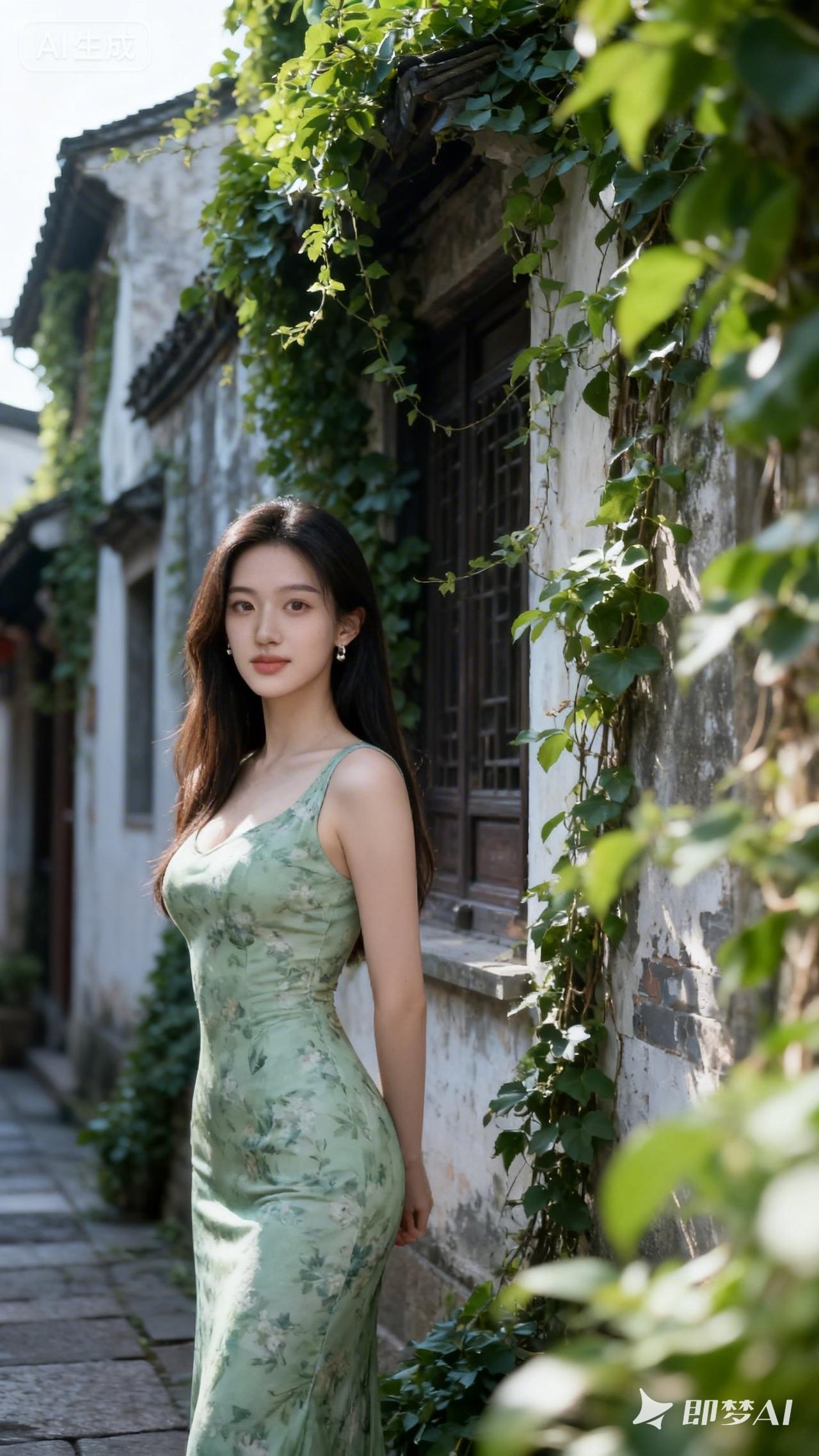 青石小巷,绿意盎然,花裙少女,悠然自得。