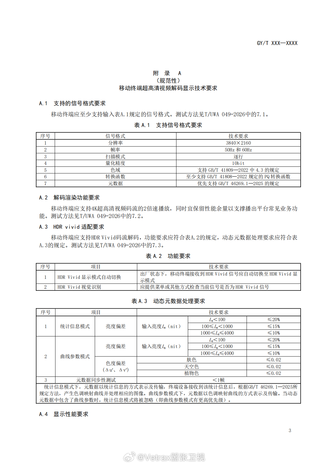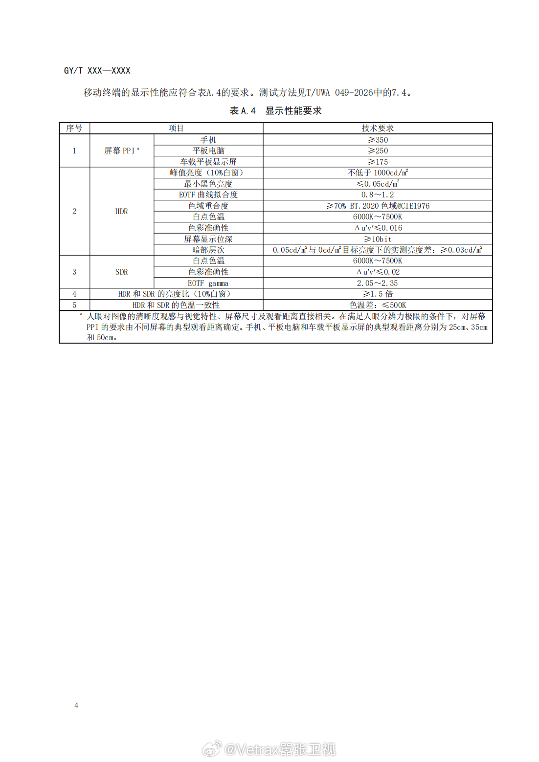 其中对横屏和竖屏的 4K 超高清视频分辨率都做了明确的要求(横屏应为 N×2160 或 3840×M;宜为 3840×2160 或 4096×2160 2160≤N≤4096,竖屏视频 应为 2160×N 或 M×3840;宜为 2160×3840 或 2160×4096),帧率宜为50、60。对移动终端要求要支持 HDR Vivid 码流解码。屏幕 PPI 也有要求(手机 ≥350,平板电脑 ≥250,车载平板显示屏 ≥175),HDR 峰值亮度(10%白窗) 不低于 1000cd/m。