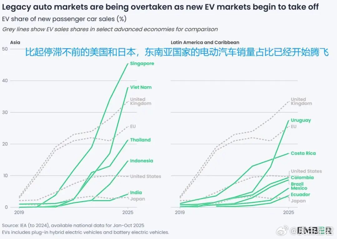 电动汽车在全部新车销量中的占比,新加坡和越南在2025年都已经超过了英国和欧盟平均,泰国和印度尼西亚也开始高速增长。相比之下,美国和日本的电动汽车销量占比基本持平。这反映了不同国家对新能源汽车的态度。而在东南亚国家销售的电动汽车里,中国品牌的占比最高。